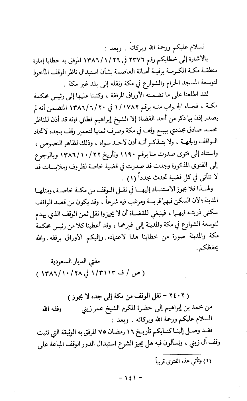 ولهذا فلايجوز الاستناد إليها في نقل الوقف من مكة خاصة، ومثلها المدينة؛ لأن السكن فيهما قربة ومرغب فيه شرعاً، وقد يكون من قصد الواقف سكني ذريته فيهما، فينبغي للقضاة أن لايجيزوا نقل ثمن الوقف الذي يهدم لتوسعة الشوارع في مكة والمدينة إلى غيرهما، وقد أعطينا كلا من رئيس محكمة مكة والمدينة صورة من خطابنا هذا لاعتماده. وإليكم الأوراق برفقه والله يحفظكم.