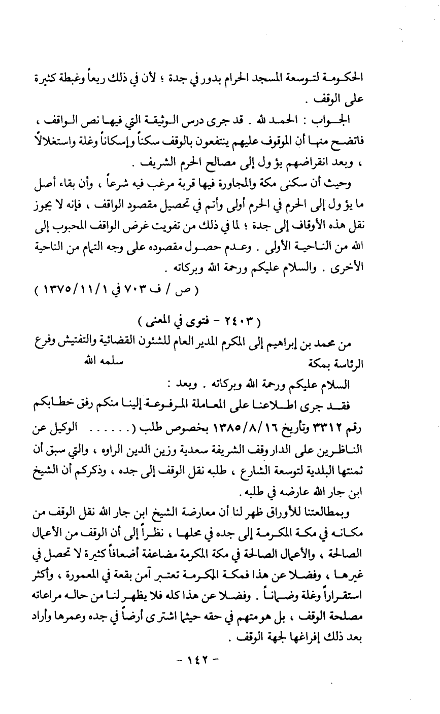وحيث أن سكني مكة والمجاورة فيها قربة مرغب فيه شرعاً، وأن بقاء أصل مايؤول إلى الحرم في الحرم أولى وأتم في تحصيل مقصود الواقف، فإنه لايجوز نقل هذه الأوقاف إلى جدة؛ لما في ذلك من تفويت غرض الواقف المحبوب إلى الله من الناحية الأولى. وعدم حصول مقصوده على وجه التمام من الناحية الأخرى. والسلام عليكم ورحمة الله وبركاته.