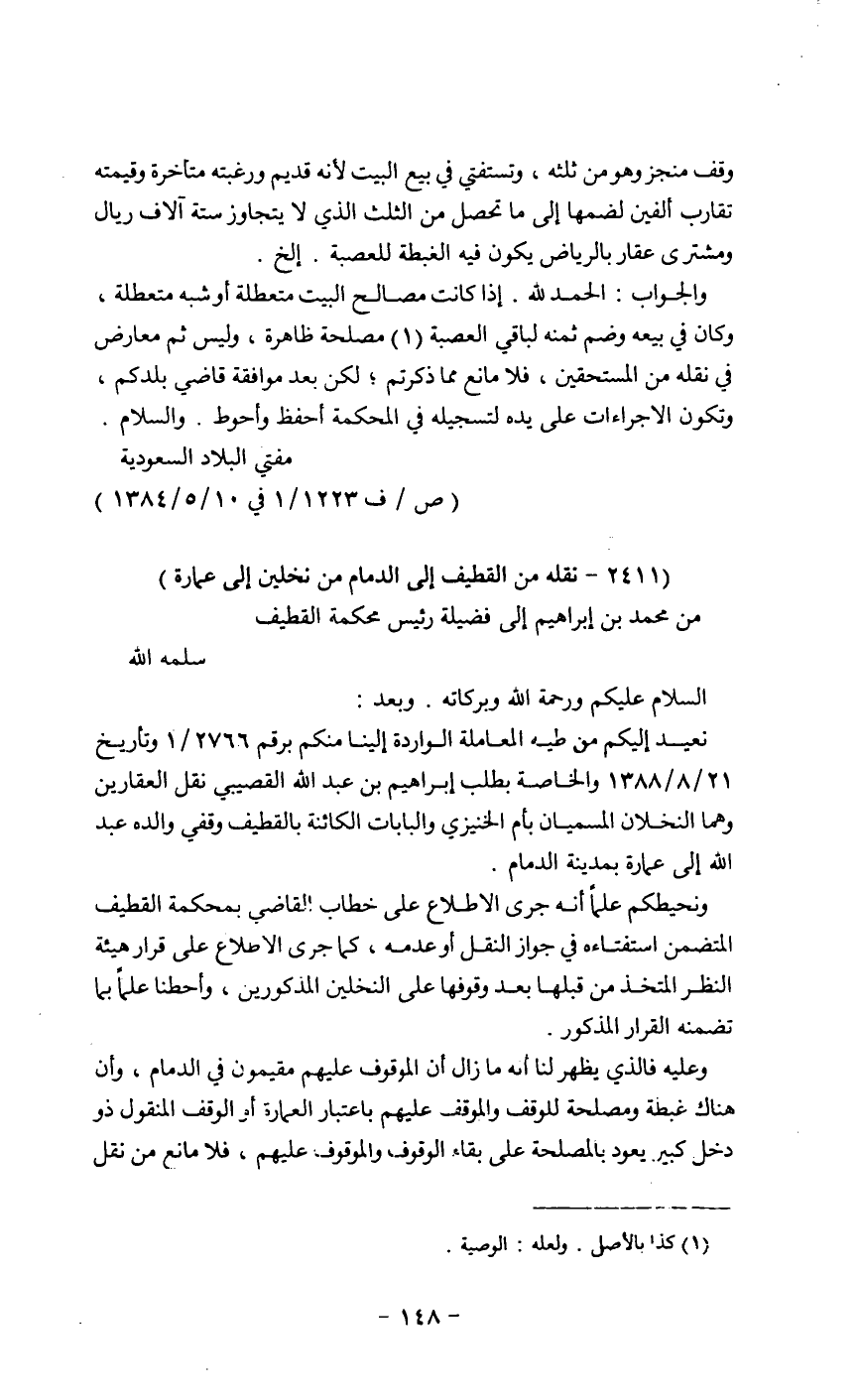 نعيد إليكم من طية المعاملة الواردة إلينا منكم برقم 2766 / 1 وتاريخ 21/8/ 1388 والخاصة بطلب إبراهيم بن عبد الله القصيبي نقل العاقرين وهما النخلان المسميان بأن الخنيزي والبابات الكائنة بالقطيف وقفي والدء عبد الله إلى عمارة بمدينة الدمام.