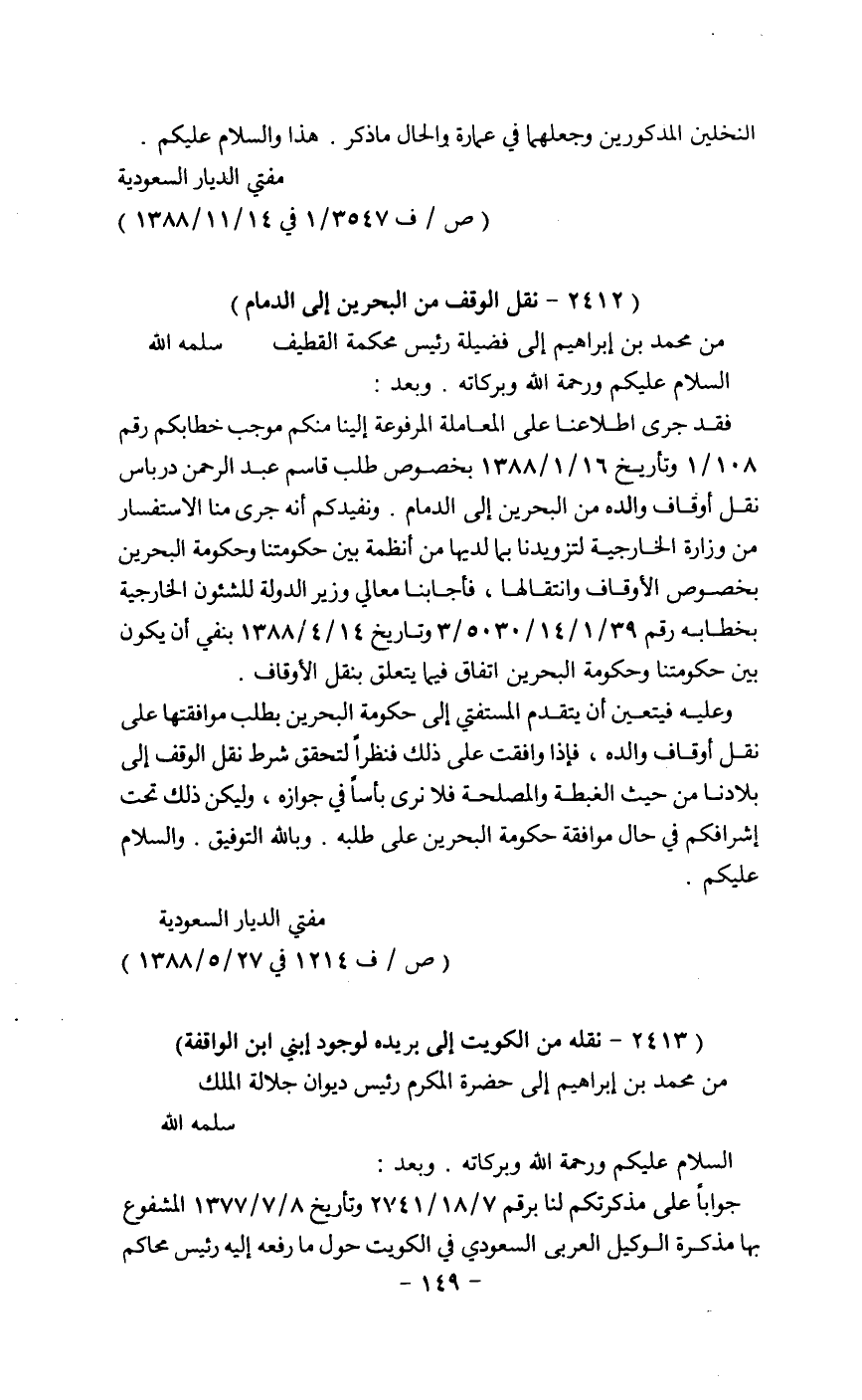 فقد جرى اطلاعنا على المعاملة المرفوعة إلينا منكم موجب خطابكم رقم 108 وتاريخ 16/1/ 1388هـ بخصوص طلب قاسم عبد الرحمن درباس نقل أوقاف والده من البحرين إلى الدمام. ونفيدكم أنه جرى منا الاستفسار من وزارة الخارجية لتزويدنا بما لديها من أنظمة بين حكومتنا وحكومة البحرين بخصوص الأوقاف وانتقالها، فأجابنا معالي وزير الدولة للشئون الخارجية بخطابه رقم 39/1/ 14 / 5030 /3 وتاريخ 14/4/ 1388 بنفي أن يكون بين حكومتنا وحكومة البحرين اتفاق فيما يتعلق بنقل الأوقاف.