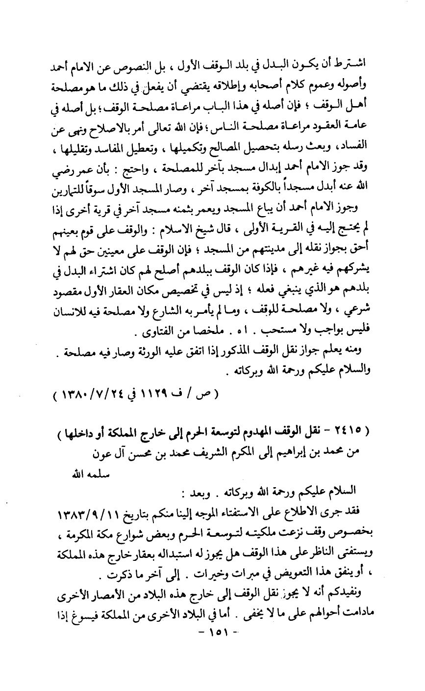 فقد جرى الاطلاع على الاستفتاء الموجه إلينا منكم بتاريخ 11/9/ 1383هـ بخصوص وقف نزعت ملكيته لتوسعة الحرم وبعض شوارع مكة المكرمة، ويستفتي الناظر على هذا الوقف هل يجوز له استبداله بعقار خارج هذه المملكة ويستفتي الناظر على هذا الوقف هل يجوز له استبداله بعقار خارج هذه المملكة، أو ينفق هذا التعويض في مررات وخيرات.. إلىآخر ماذكرت.
