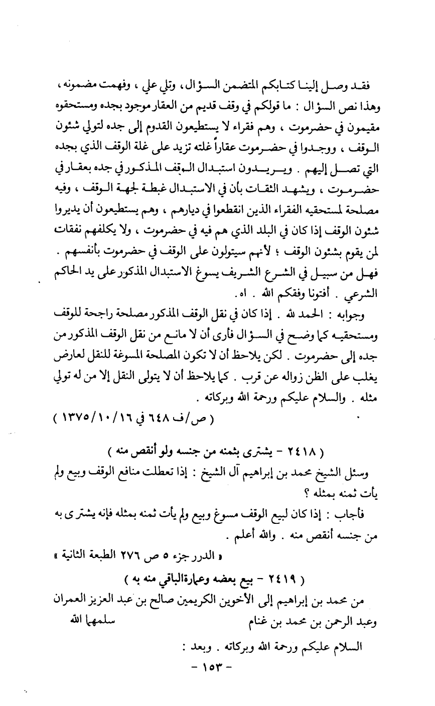 فقد وصل إلينا كتابكم المتضمن السؤال، وتلي علي، وفهمت مضمونه، وهذا نص السؤال: ماقولكم في وقف قديم من العقار موجود بجده ومستحقوه مقيمون في حضرموت، وهم فقراء لايستطيعون القدوم إلى جده لتولي شئون الوقف، ووجدوا في حضرموت عقاراً غلته تزيد على غلة الوقف الذي بجد التي تصل إليهم. ويريدون استبدال الوقف المذكور في جده بعقار في حضرموت، ويشهد الثقات بأن في الاستبدال غبطة لجهة الوقف، وفيه مصلحة لمستحقية الفقراء الذين انقطعوا في ديارهم، وهم يستطيعون أن يدبروا شئون الوقف إذا كان في البلد الذي هم فيه في حضرموت، ولايكلفهم نفقات لمن يقوم بشئون الوقف؛ لأنهم سيتولون على الوقف في حضرموت بأنفسهم.