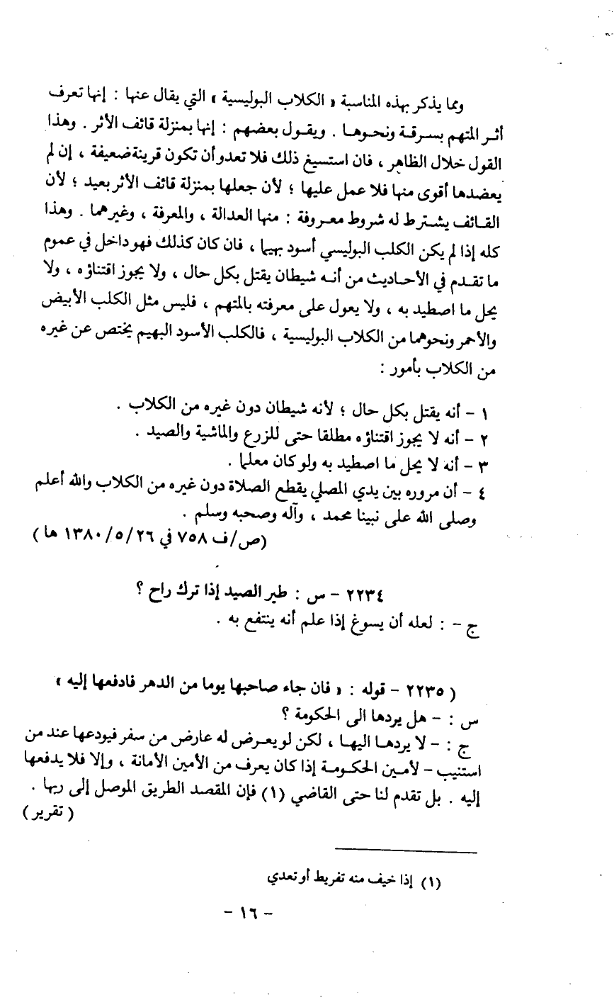 ومما يذكر بهذه المناسبة " الكلاب البوليسية " التي يقال عنها: إنها تعرف أثر المتهم بسرقة ونحوها. ويقول بعضهم: أنها بمنزلة قائف الأثر. وهذا القول خلال الظاهر، فان استسبغ ذلك فلا تعدو أن تكون قرينة ضعيفة، إن لم يعضدها أقوى منها فلا علم عليها؛ لأن جعلها بمنزلة قائف الأثر بعيد؛ لأن القائف يشترط له شروط معروفة: منها العدالة، والمعرفة، وغيرهما. وهذا كله إذا لم يكن الكلب البوليسي أسود بهيماً، فإن كان كذلك فهو داخل في عموم ماتقدم في الأحاديث من أنه شيطان يقتل بكل حال، ولايجوز اقتناؤه، ولا يحل ماصطيد به، ولايعول على معرفته بالمتهم، فليس مثل الكلب الأبيض والأحمر ونحوهما من الكلاب البوليسية، فالكلب الأسود البهيم يختص عن غيره من الكلاب بأمور.