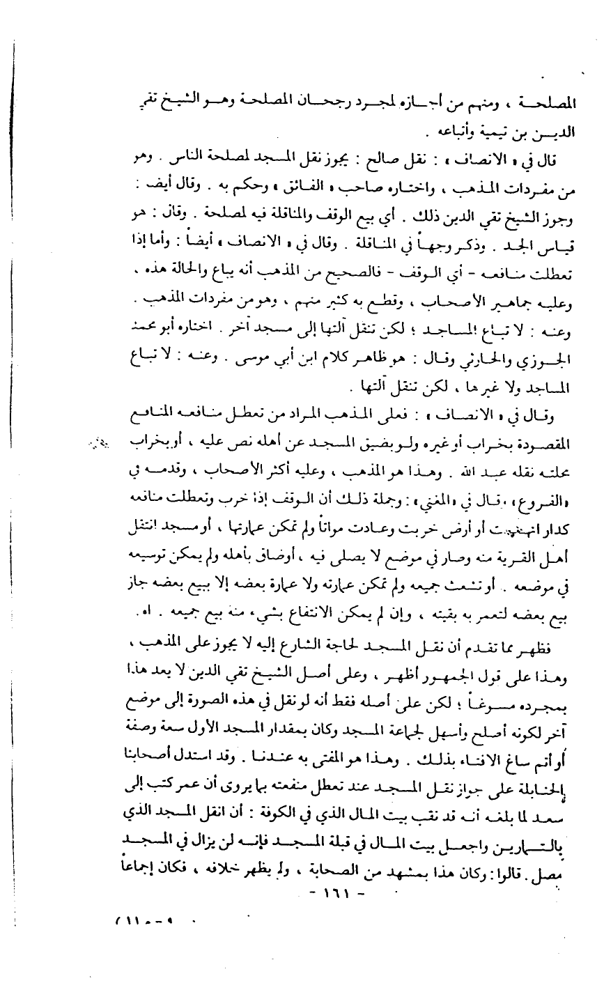 قال في " الأنصاف ": نقل صالح: يجوز نقل المسجد لمصلحة الناس. وهو من مفردات المذهب، واختاره صاحب " الفائق " وحكم به. وقال أيضاً: وجوز الشيخ تقي الديم ذلك. أي بيع الوقف والمناقلة فيه لمصلحة. وقال: هو قياس الجد. وذكر وجهاً في المناقلة. وقال في " الانصاف " أيضاً: وأما إذا تعطلت منافعة ـ أي الوقف ـ فالصحيح من المذهب أنه يباع والحالة هذه وعليه جماهير الأصحاب، وقطع به كثير منهم، وهو من مفردات المذهب.
