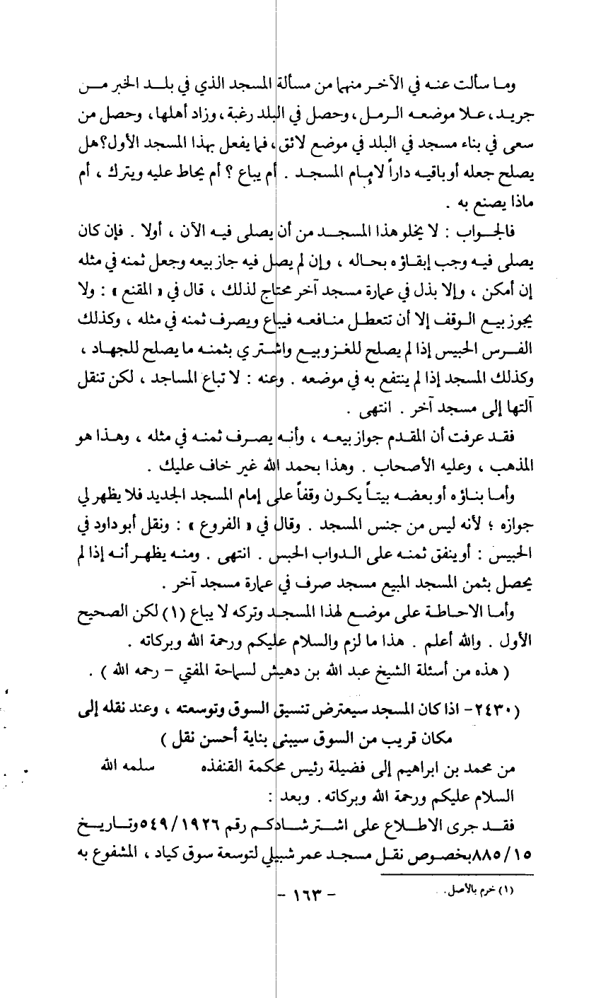 وأما الاحاطة على موضع لهذا المسجد وتركه لايباع (¬1) لكن الصحيح الأول. والله أعلم. هذا مالزم والسلام عليكم ورحمة الله وبركاته.