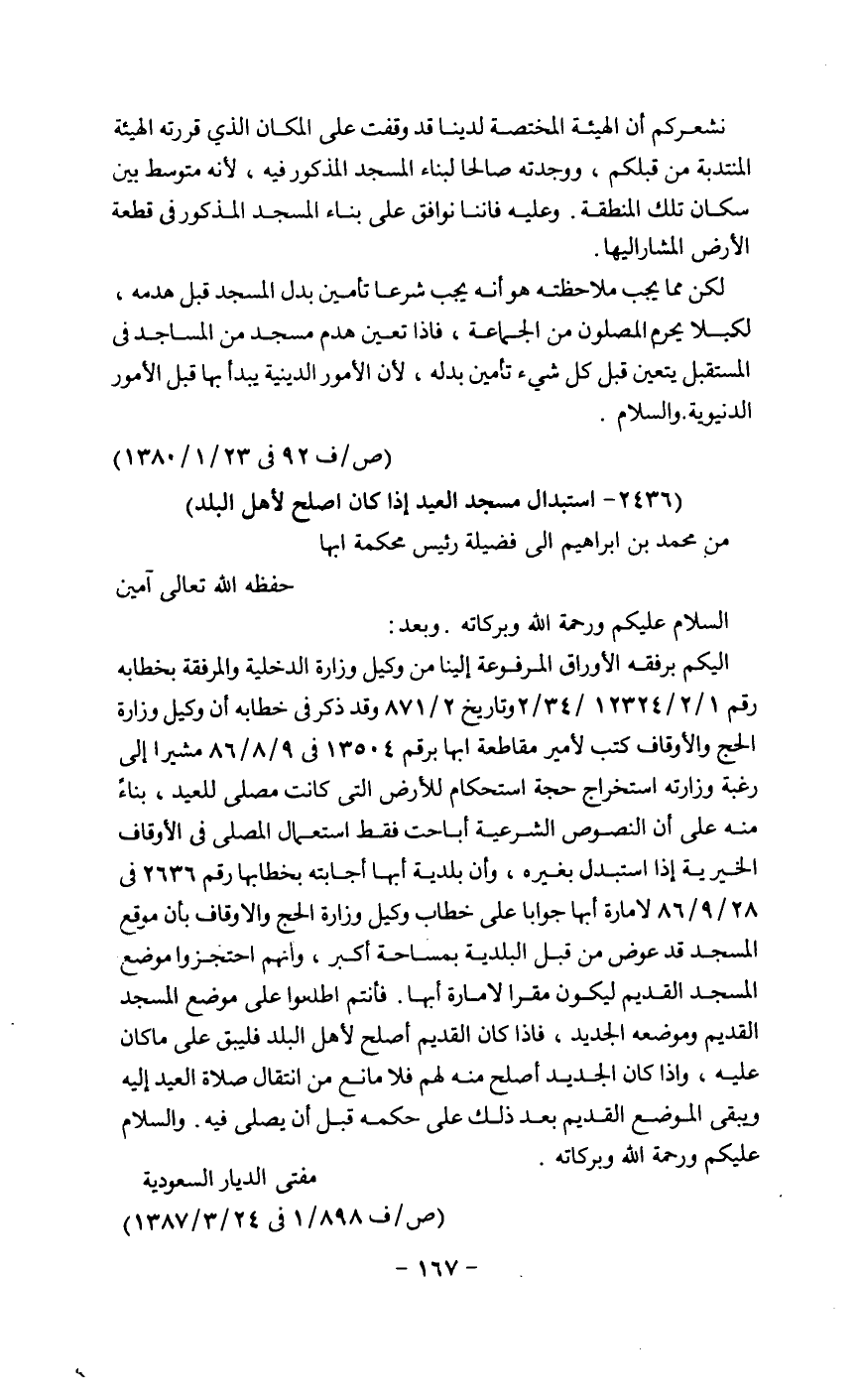 اليكم برفقة الأوراق المرفوعة إلينا من وكيل وزارة الداخلية والمرفقة بخطابه رقم 1/2/ 12324 م 34 / 2 وتاريخ 2/871 وقد ذكر في خطابه أن وكيل وزارة الحج والأوقاف كتب لأمير مقاطعة أبها برقم 13504 في 9/8/ 86 مشيرا إلى رغبة وزارته استخراج حجة استحكام للأرض التي كانت مصلى للعيد، بناء منه على أن النصوص الشرعية أباحت فقط استعمال المصلى في الأوقات الخيرية إذا استبدل بغيره، وأن بلدية أبها أجابته بخطابها رقم 2636 في 28/9/ 86 لامارة أبها جوابا على خطاب وكيل وزارة الحج والأوقاف بأن موقع المسجد قد عوض من قبل البلدية بمساحة أكبر، وأنهم احتجزوا موضع المسجد القديم وموضعه الجديد، فإذا كان القديم أصلح لأهل البلد فليبق على ماكان عليه، وإذا كان الجديد أصلح منه لهم فلامانع من انتقال صلاة العيد إليه ويبقى الموضع القديم بعد ذلك على حكمه قبل أن يصلي فيه. والسلام عليكم ورحمة الله وبركاته..
