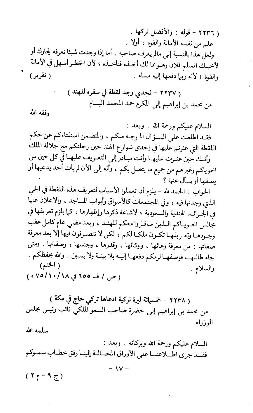 فقد أطلعت علىالسؤال الموجه منكم، والمتضمن استفتاءكم عن حكم اللقطة التي عثرتم عليها في إحدى شوارع الهند حين رحلتكم مع جلالة الملك وأنك حين عشرت عليها وأنت مبادر إلىالتعريف عليها في كل حين من اخوياكم وغيرهم من جميع مايتصل بكم، وأنه إلى الآن لم يأت أحد يدعيها أو يصفها أو يسأل عنها؟