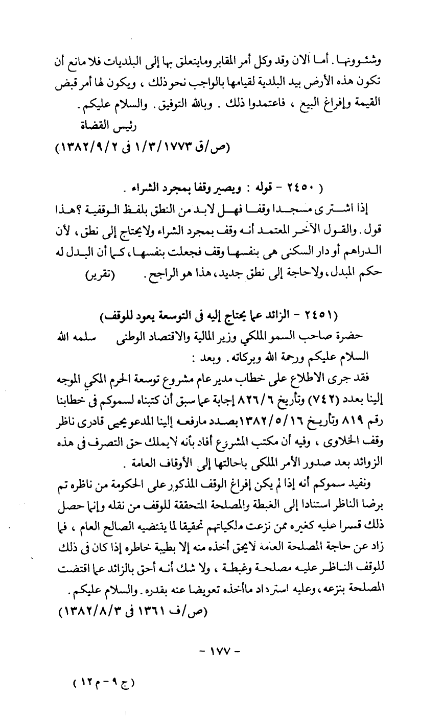 فقد جرى الاطلاع على خطاب مدير عام مشروع توسعة الحرم المكي الموجه إلينا بعدد (742) وتاريخ 6/ 826 إجابة عما سبق أن كتبناه لسموكم في خطابنا رقم 819 وتاريخ 16/5/ 1382هـ بصدد مارفعه إلينا المدعي يحيى قادري ناظر وقف الخلاوي، وفيه أن مكتب المشروع أفاد بأنه لايملك حق التصرف في هذه الزوائد بعد صدور الأمر الملكي باحالتها إلى الأوقاف العامة.