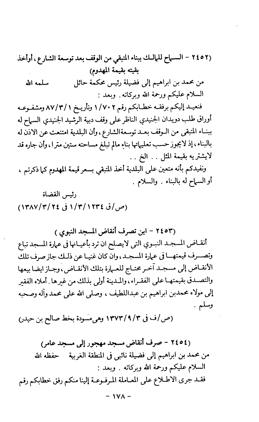أنقاض المسجد النبوي التي لايصلح أن ترد بأعيانها في عمارة المسجد تباع وتصرف قيمتها في عمارة المسجد، وأن كان غنيا عن ذلك جاز صرف تلك الأنقاض إلى مسجد آخر محتاج للعمارة بتلك الأنقاض، وجاز ايضاًُ بيعها والتصدق بقيمتها على الفقراء، والمدينة أولى بذلك من غيرها. أملاه الفقير إلى مولاه محمد بن ابراهيم بن عبد اللطيف، وصلى الله على محمد وآله وصحبه وسلم.