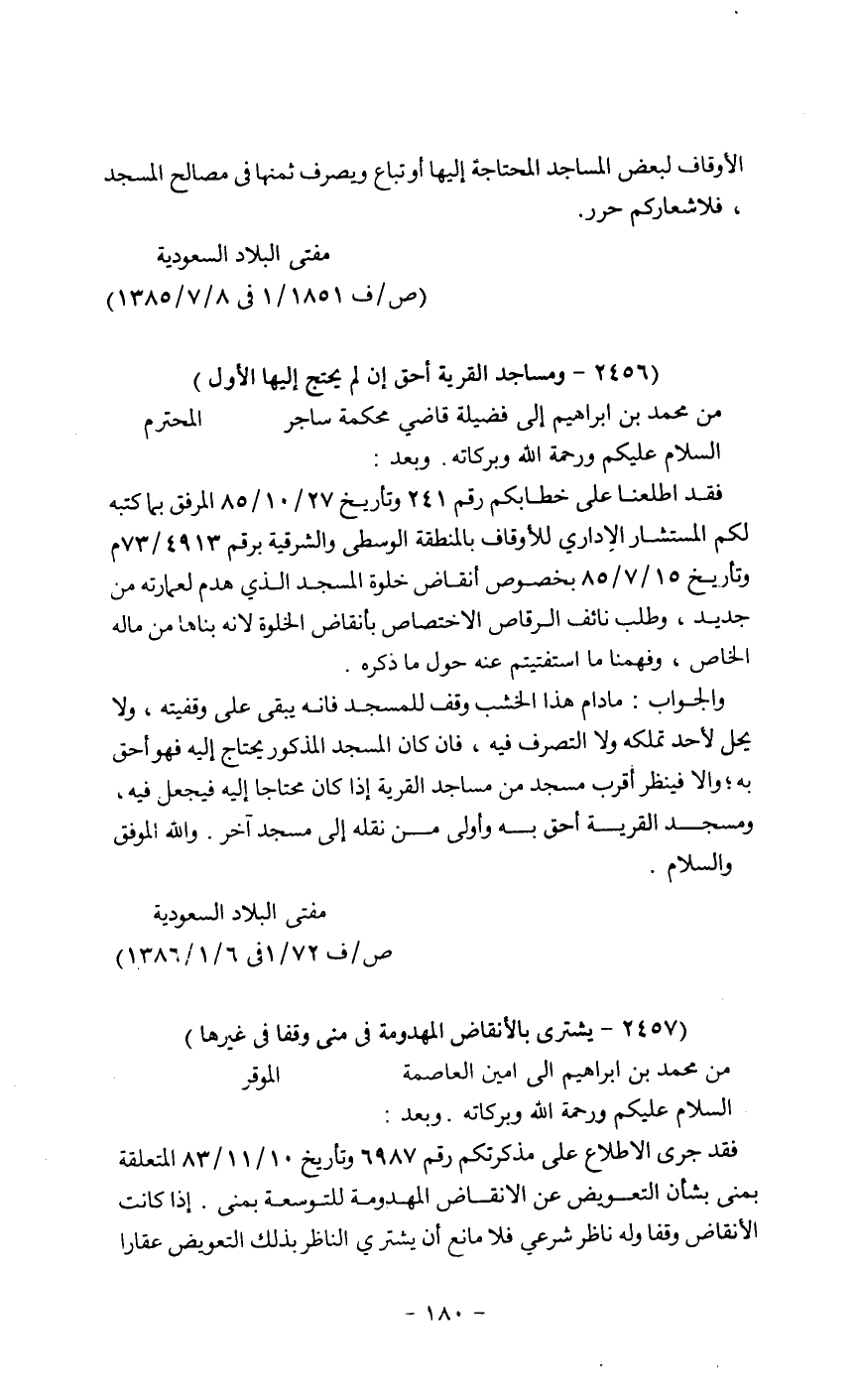 فقد أطلعنا على خطابكم رقم 241 وتاريخ 27/10/ 85 المرفق بما كتبه لكم المستشار الإداري للأوقاف بالمنطقة الوسطى والشرقية برقم 4913 / 73 م وتاريخ 15/7/ 85 بخصوص أنقاض خلوة المسجد الذي هدم لعمارته من جديد، وطلب نائف الرقاص الاختصاص بأنقاض الخلوة لأنه بناها من ماله الخاص، وفهمنا ما استفتيتم عنه حول ماذكره.
