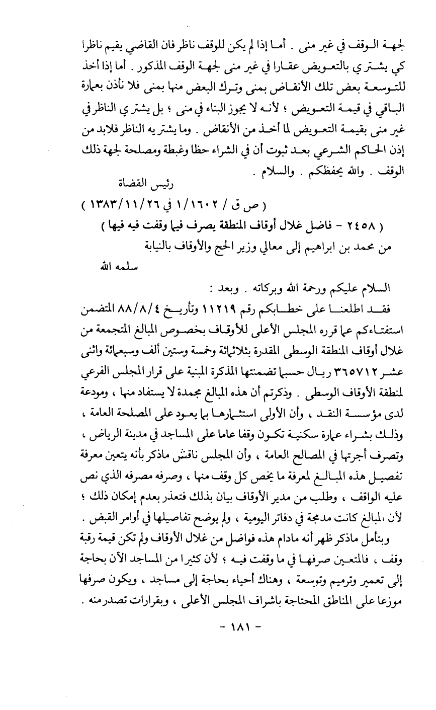 لجهة الوقف في غير منى. أما إذا لم يكن للوقف ناظر فغن القاضي يقيم ناظرا كي يشتري بالتعويض عقارا في غير مني لجهة الوقف المذكور. أما إذا أخذ للتوسعة بعض تلك الأنقاض بمنى وترك البعض منها بمنى فلا نأذن بعمارة الباقي في قيمة التعويض؛ لأنه لايجوز البناء في منى؛ بل يشتري الناظر في غير منى بقيمة التعويض لما أخذ من الأنقاض. ومايشتريه الناظر فلابد من إذن الحاكم الشرعي بعد ثبوت أن في الشراء حظا وغبطة ومصلحة لجهة ذلك الوقف. والله يحفظكم. والسلام.