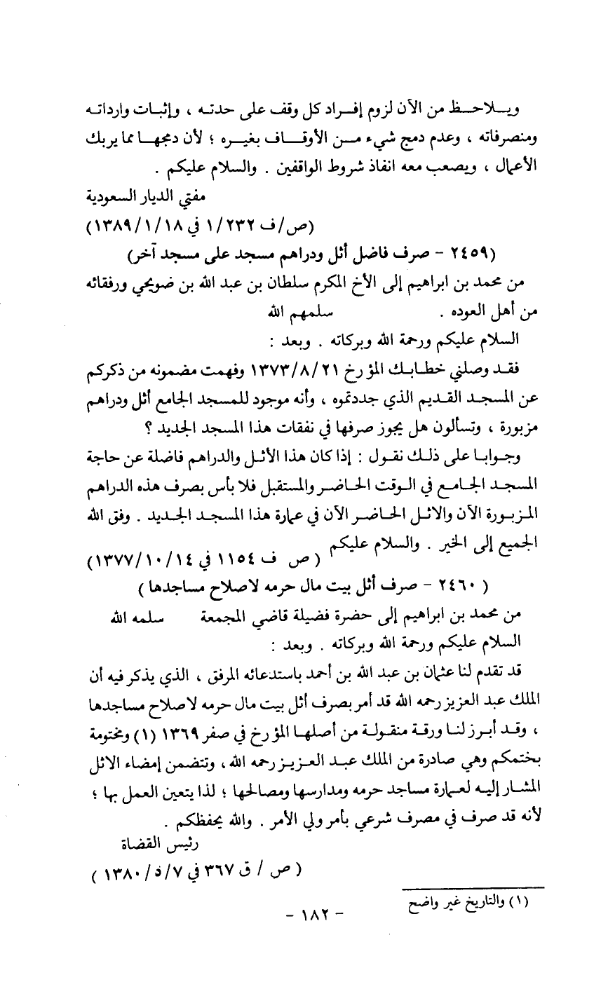 فقد وصلني خطابك المؤرخ 21/8/ 1373وفهمت مضمونه من ذكركم عن المسجد القديم الذي جددتموه، وأنه موجود للمسجد الجامع أثل ودراهم مربورة، وتسألون هل يجوز صرفها في نفقات هذا المسجد الجديد؟