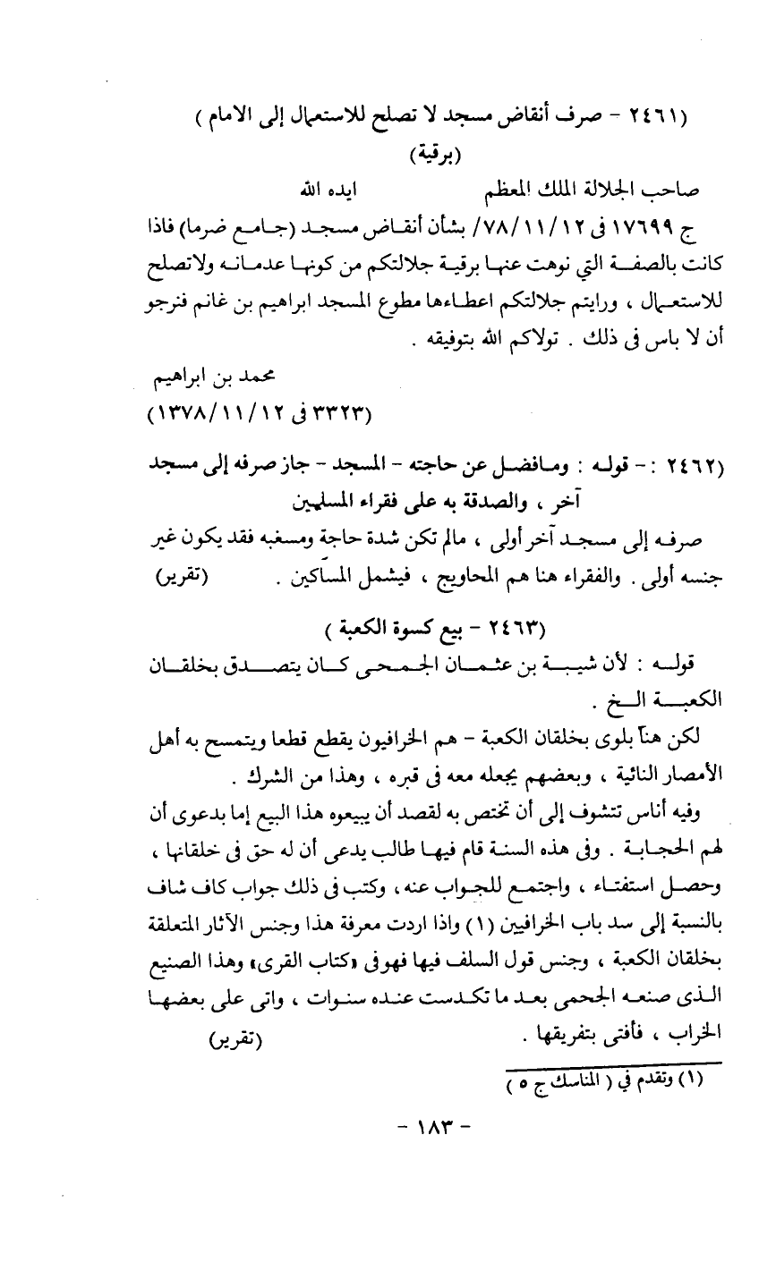 ج 17699 في 12/11/ 78 بشأن أنقاض مسجد (جامع ضرما) فإذا كانت بالصفة التي نوهت عنها برقية جلالتكم من كونها عدمانه ولاتصلح للاستعمال، ورايتم جلالتكم اعطاءها مطوع المسجد ابراهيم بن غانم فنرجو أن لاباس في ذلك. تولاكم الله بتوفيقه.