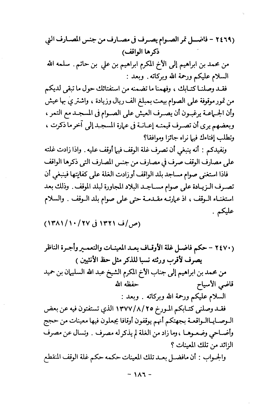فقد وصلني كتابكم المؤرخ 25/8/ 1377 الذي تستفتون فيه عن بعض الوصايا الواقعة بجهتكم أنهم يوقفون أوقاتا يجعلون فيها معينات من حجج وأضاحي وضعوها ومازاد من الغلة لم يذكر له مصرف. وتسأل عن مصرف الزائد من تلك المعينات؟