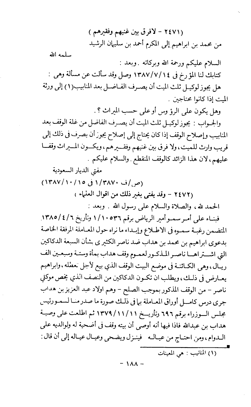 فبناء على أمر سمو أمير الرياض برقم 10536 / 1 وتاريخ 6/4/ 13858هـ المتضمن رغبة سموه في الأطلاع وإبداء مانراه حول المعاملة المرفقة الخاصة بدعوى ابراهيم بن محمد بن هداب ضد ناصر الكثيري بشأن السبعة الدكاكين التي اشتراها ناصر المذكور لعموم وقف هداب بمأة وستة وسبعين ألف ريال، وهي الكائنة في موضع البيت الوقف الذي بيع لأجل تعطله، وابراهيم يعارض في ذلك، ويطلب أن تكون الدكاكين من النصف الذي يخص موكلي ناصر ـ من الوقف المذكور بموجب الصلح ـ وهم أولاد عبد العزيز بن هداب جري درس كامل أوراق المعاملة بما في ذلك صورة ماصدر منا لسمو رئيس مجلس الوزراء برقم 696 وتاريخ 11/11/ 1379هـ ثم اطلع على وصية هداب بن عبد الله فإذا فيها أنه أوصى أن بيته وقف في أضحية له ولوالديه على الدوام، ومن أحتاج من عياله فينزل ويضحي وعيال عياله إلى أن قال
