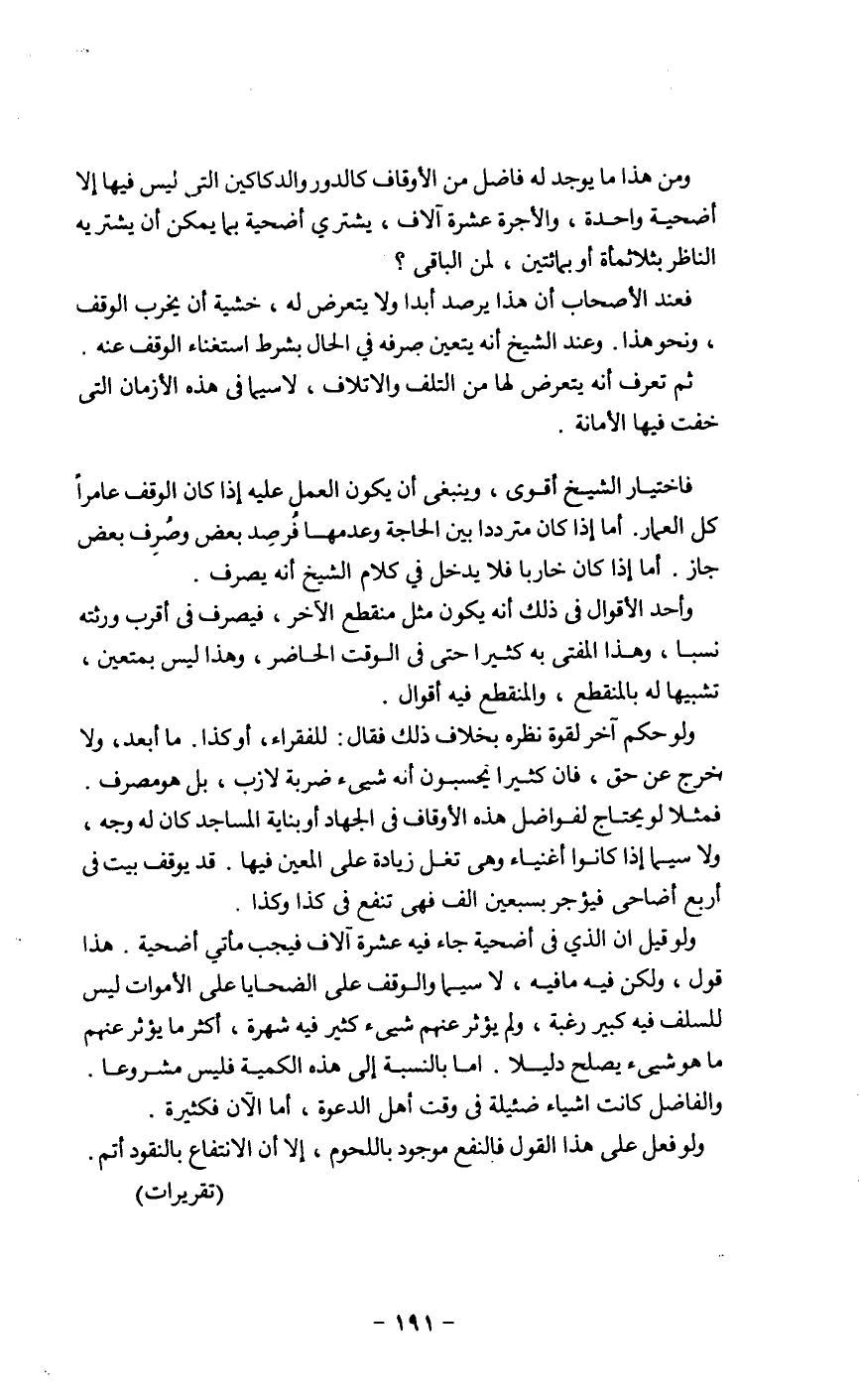 فمثلاً لو يحتاج لفواضل هذه الأوقاف في الجهاد أو بناية المساجد كان له وجه، ولاسيما إذا كانوا أغنياء وهي تغل زيادة على المعين فيها. قد يوقف بيت في أربع أضاحي فيؤجر بسبعين الف فهي تنفع في كذا وكذا.