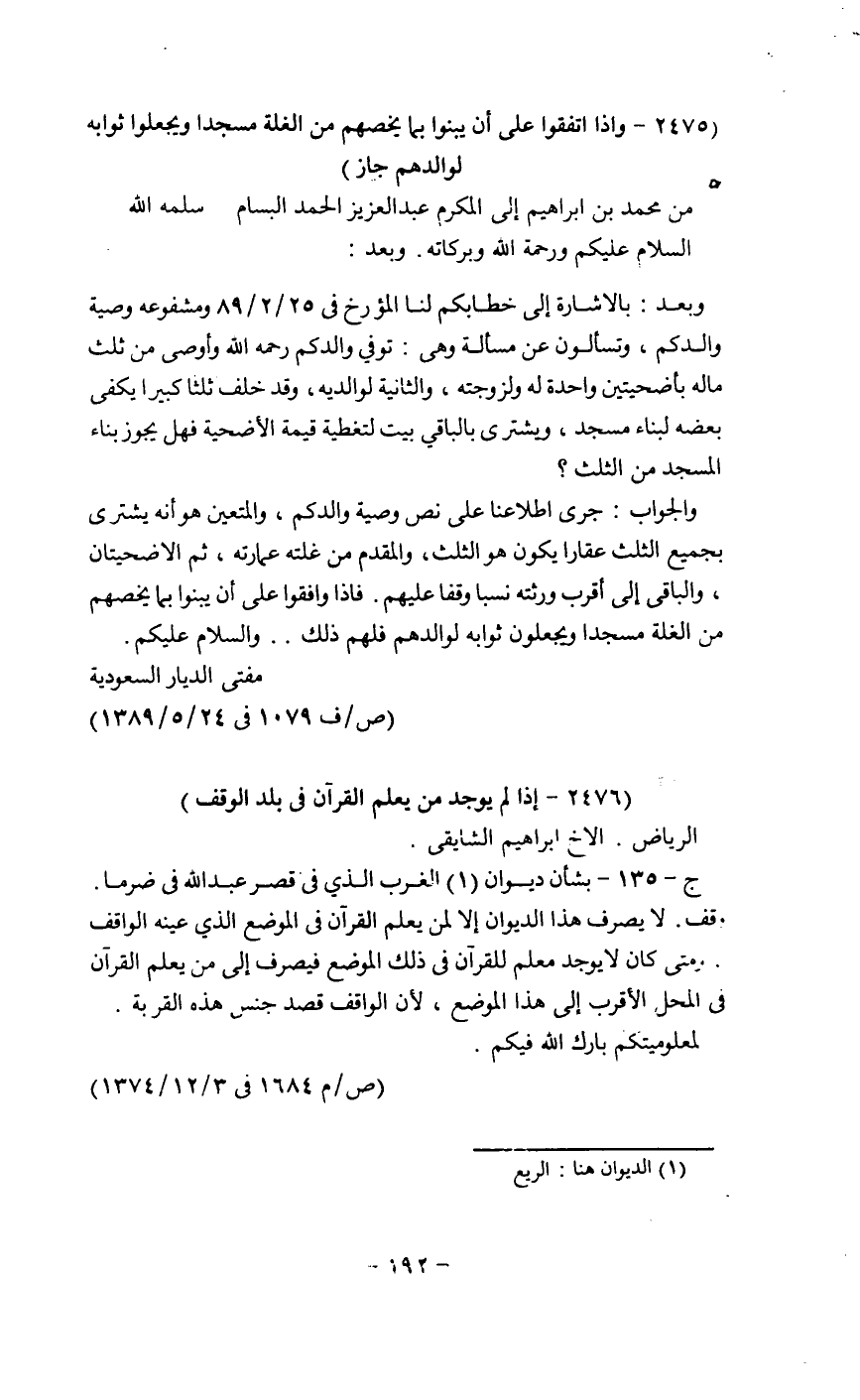 ج ـ 135 ـ بشأن ديوان (¬1) الغرب الذي في قصر عبد الله في ضرما. قف. لايصرف هذا الديوان إلا لمن يعلم القرآن في الموضع الذي عينه الواقف ومتى كان لايوجد معلم للقرآن في ذلك الموضع فيصرف إلى من يعلم القرآن في المحل الأقرب إلى هذا الموضع، لان الواقف قصد جنس هذه القربة لمعلوميتكم بارك الله فيكم.
