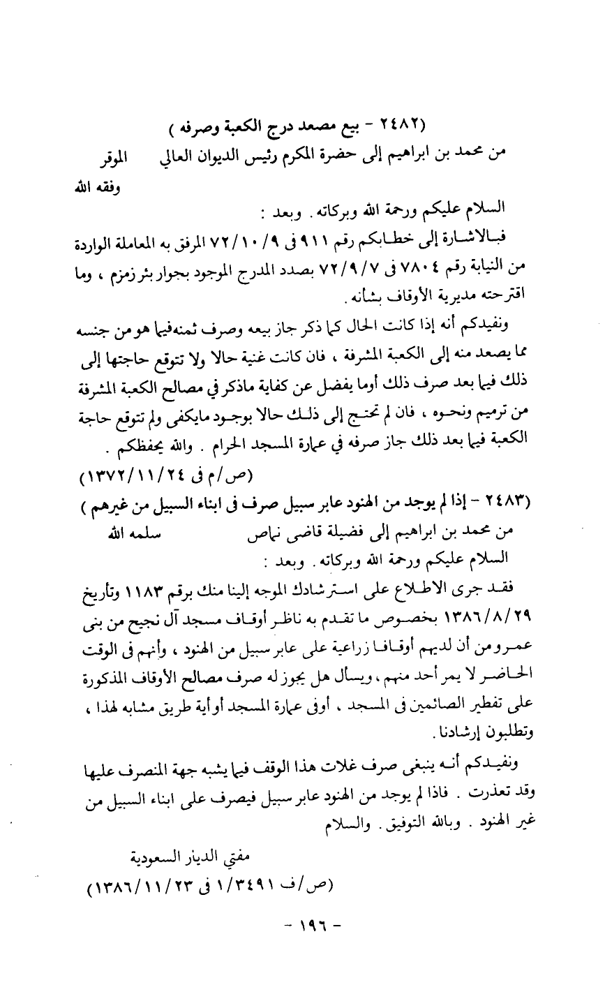 فقد جرى الاطلاع على استرشادك الموجه إلينا منك برقم 1183 وتاريخ 29/8/ 1386بخصوص ماتقدم به ناظر أوقاف مسجد آل نجيح من بني عمرو من أن لديهم أوقافا زراعية على عابر سبيل من الهنود، وأنهم في الوقت الحاضر لايمر أحد منهم، ويسأل هل يجوز له صرف مصالح الأوقاف المذكورة على تفطير الصائمين في المسجد، أو في عمارة المسجد أو أية طريق مشابه لهذا، وتطلبون إرشادنا.