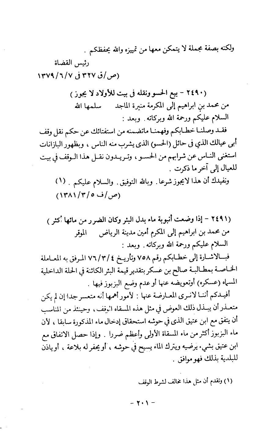 أفيدكم أننا لانرى المعارضة عنها: لأمور أهمها أنه متعسر جدا إن لم يكن متعذر أن يبذل ذلك العوض في مثل هذه المسقاه الوقف، وحينئذ من المناسب أن يتفق مع ابن عتيق الذي في حوشه استحقاق إدخال ماء المذكورة سابقا، لأن ماء البزبوز أكثر من ماء المسقاة الأولى وأعظم ضررا. وإذا حصل الاتفاق مع ابن عتيق بشيء يرضيه ويترك الماء يسبح في حوشه، أو يحفر له بلاعة أو ياذن للبلدية بذلك فهو موافق.