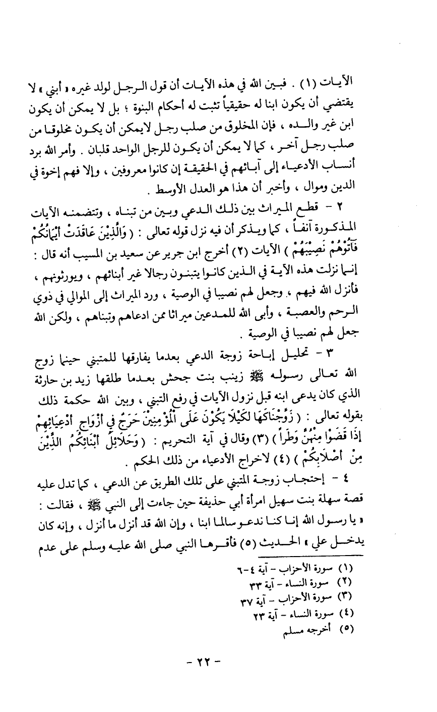4 - إحتجاب زوجة المتبني على تلك الطريق عن الدعي، كما تدل عليه قصة سهلة بنت سهيل امرأة أبي حذيفة حين جاءت إلى النبي صلى الله عليه وسلم، فقالت: " يارسول الله إنا كنا ندعو سالما ابنا، وإن الله قد أنزل ما أنزل، وإنه كان يدخل علي " الحديث (¬5) فأقرها النبي صلى الله عليه وسلم على عدم