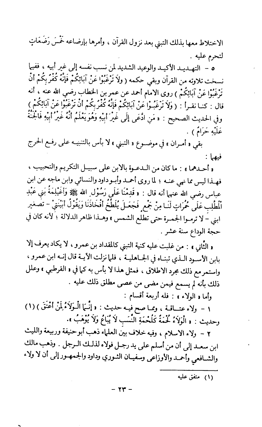 " والثاني ": من غلبت عليه كنية التبني كالمقداد بن عمرو، لايكاد يعرف إلا بابن الأسود الذي تبناه في الجاهلية، فلما نزلت الآية قال إنه ابن عمرو، واستمر مع ذلك مجرد الاطلاق، فمثل هذا لابأس به كما في " القرطبي " وعلل ذلك بأنه لم يسمع فيمن مضى من عصى مطلق ذلك عليه.