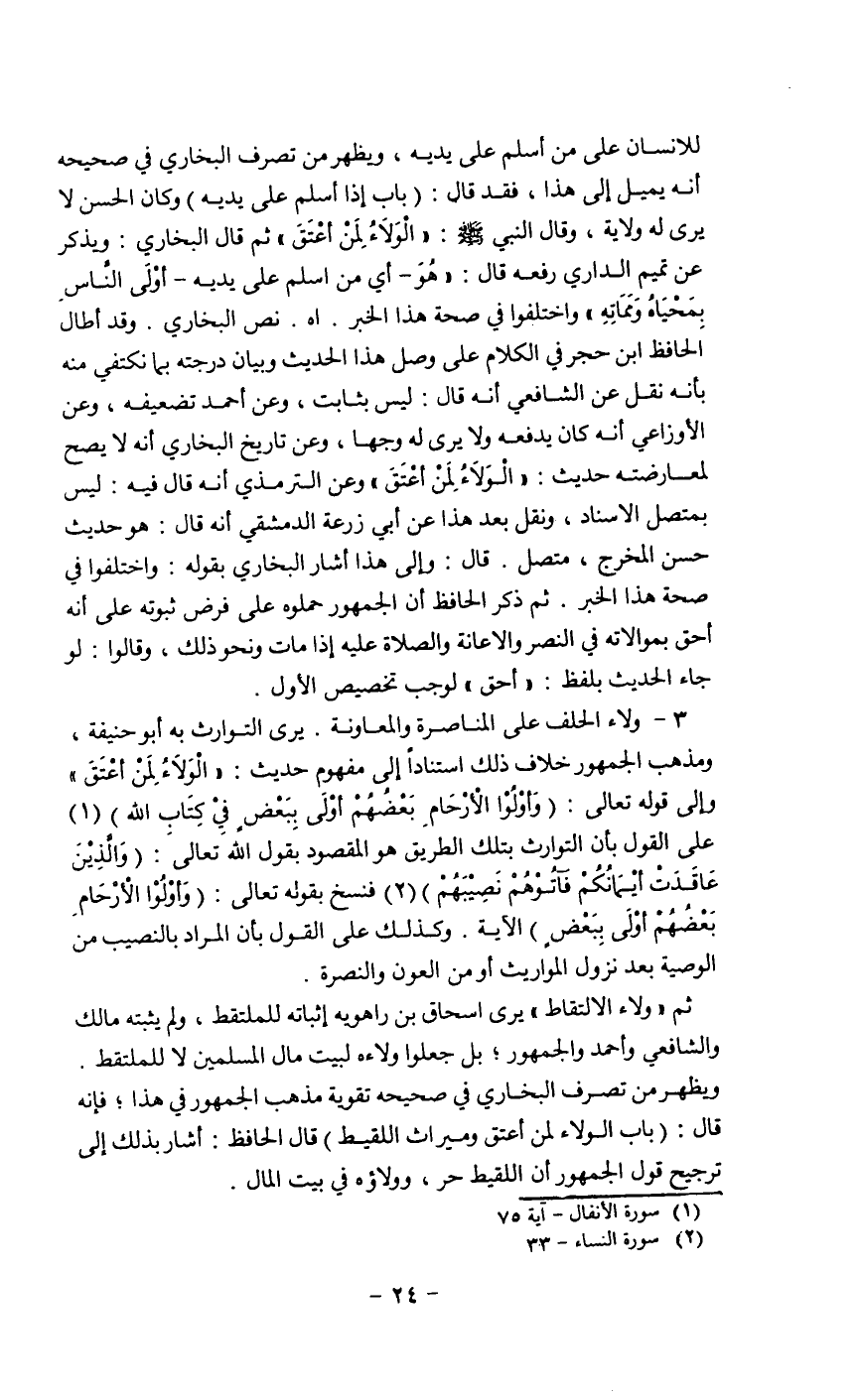للانسان على من أسلم على يديه، ويظهر من تصرف البخاري في صحيحه أنه يميل إلى هذا، فقد قال: (باب إذا أسلم على يديه) وكان الحسن لا يرى له ولاية، وقال النبي صلى الله عليه وسلم: " الولاء لمن أعتق " ثم قال البخاري: ويذكر عن تميم الداري رفعه قال: " هو ـ أي من اسلم على يديه ـ أولى الناس بمحياه ومماته " واختلفوا في صحة هذا الخبر. أه. نص البخاري، وقد أطال الحافظ ابن حجر في الكلام على وصل هذا الحديث وبيان درجته بما نكتفي منه بأنه نقل عن الشافعي أنه قال: ليس بثابت، وعن أحمد تضعيفه، وعن الأوزاعي أنه كان يدفعه ولايرى له وجها، وعن تاريخ البخاري أنه لايصح لمعارضته حديث: " الولاء لمن اعتق " وعن الترمذي أنه قال فيه: ليس بمتصل الاسناد، ونقل بعد هذا عن أبي زرعة الدمشقي أنه قال: هو حديث حسن المخرج، متصل. قال: وإلى هذا أشار البخاري بقوله: واختلفوا في صحة هذا الخبر. ثم ذكر الحافظ أن الجمهور حملوه على فرض ثبوته على أنه أحق بموالاته في النصر والاعانة والصلاة عليه إذا مات ونحو ذلك، وقالوا: لو جاء الحديث بلفظ: " أحق " لوجب تخصيص الأول.