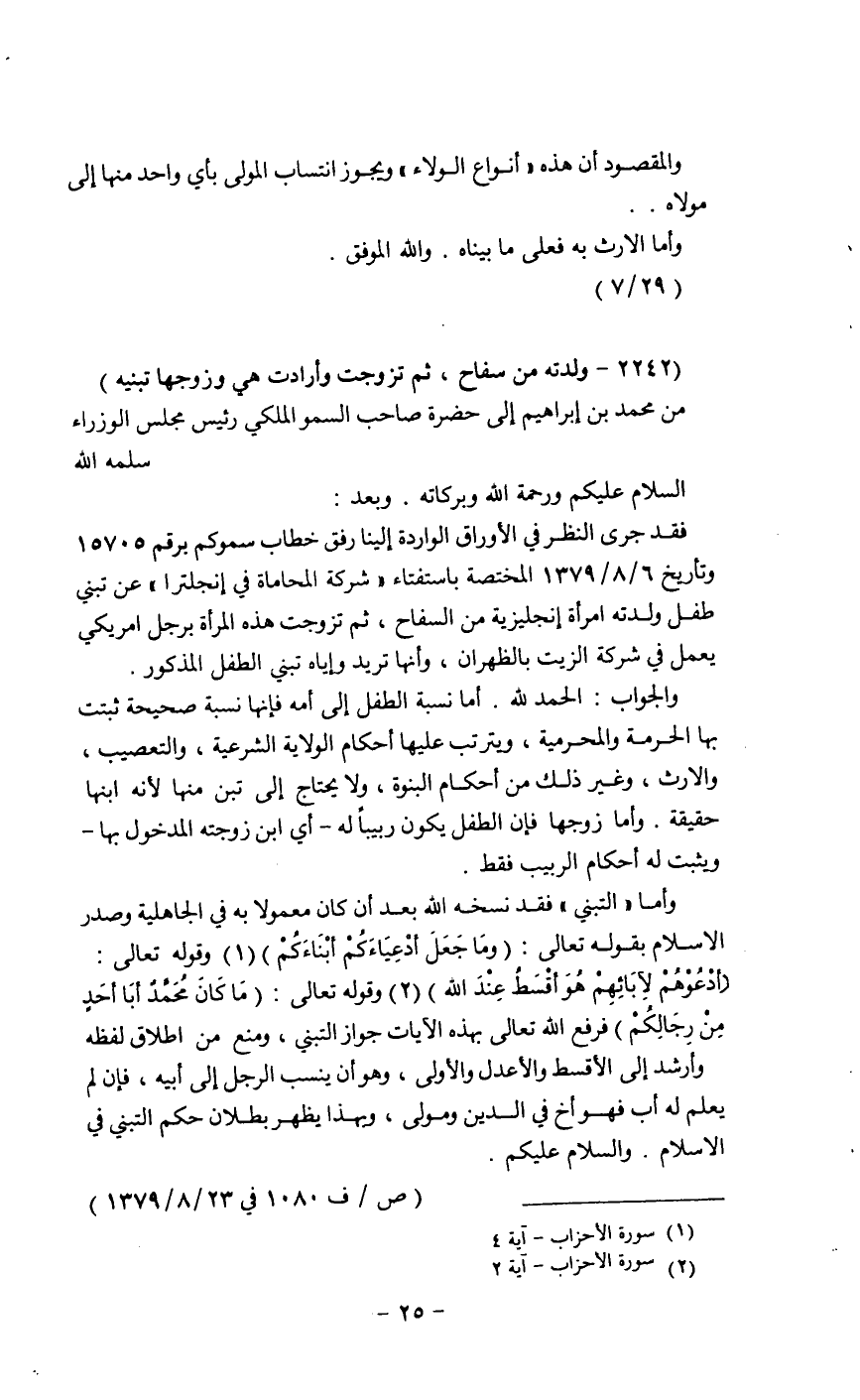 فقد جرى النظر في الأوراق الواردة إلينا رفق خطاب سموكم برقم 15705 وتاريخ 6/8/ 1379هـ المختصة باستفتاء " شركة المحاماة في إنجلترا " عن تبني طفل ودلته امرأة إنجليزية من السفاح، ثم تزوجت هذه المرأة برجل امريكي يعمل في شركة الزيت بالظهران، وأنها تريد وإياه تبني الطفل المذكور.