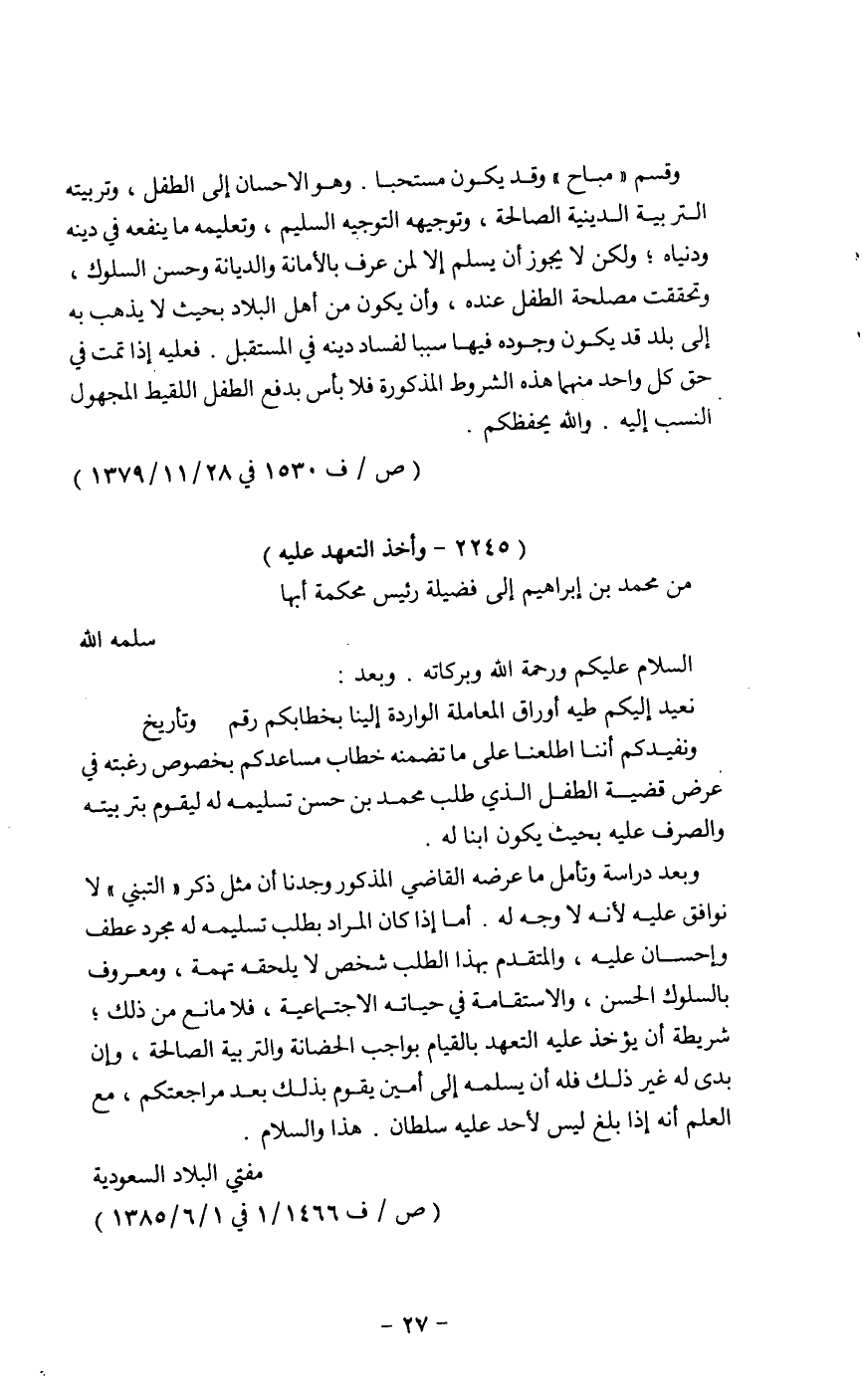 وبعد دراسة وتأمل ماعرضه القاضي المذكور وجدنا أن مثل ذكر " التبني " لا نوافق عليه لأنه لاوجه له. أما إذا كان المراد بطلب تسليمه له مجرد عطف وإحسان عليه، والمتقدم بهذا الطلب شخص لايلحقه تهمة، ومعروف بالسلوك الحسن، والاستقامة في حياته الاجتماعية، فلا مانع من ذلك؛ شريطة أن يؤخذ عليه التعهد بالقيام بواجب الحضانة والتربية الصالحة، وإن بدى له غير ذلك فله أن يسلمه إلى أمين يقوم بذلك بعد مراجعتكم، مع العلم أنه إذا بلغ ليس لأحد عليه سلطان. هذا والسلام.
