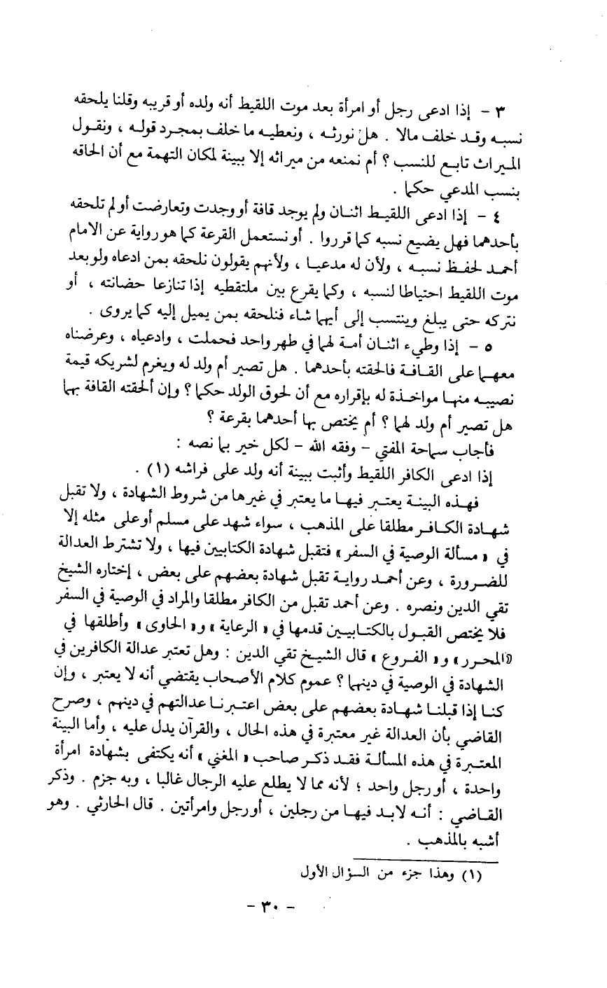 فهذه البينة يعتبر فيها مايعتبر في غيرها من شروط الشهادة، ولاتقبل شهادة الكافر مطلقا على المذهب، سواء شهد على مسلم أو على مثله إلا في " مسألة الوصية في السفر " فتقبل شهادة الكتابيين فيها، ولاتشترط العدالة للضرورة، وعن أحمد رواية تقبل شهادة بعضهم على بعض، إختاره الشيخ تقي الدين ونصره. وعن أحمد تقبل من الكافر مطلقا والمراد في الوصية في السفر فلايختص القبول بالكتابيين قدمها في " الرعاية " و " الحاوي " وأطلقها في " المحرر و " الفروع " قال الشيخ تقي الدين: وهل تعتبر عدالة الكافرين في الشهادة في الوصية في دينهما؟ عموم كلام الأصحاب يقتضي أنه لايعتبر، وإن كنا إذا قبلنا شهادة بعضهم على بعض اعتبرنا عدالتهم في دينهم، وصرح القاضي بأن العدالة غير معتبرة في هذه الحال، والقرآن يدل عليه، وأما البينة المعتبرة في هذه المسألة فقد ذكر صاحب " المغني " أنه يكتفي بشهادة أمرأة واحدة، أو رجل واحد؛ لأنه مما لايطلع عليه الرجال غالبا، وبه جزم. وذكر القاضي: أنه لابد فيها من رجلين. أو رجل وامرأتين. قال الحارثي.. وهو أشبه بالمذهب.