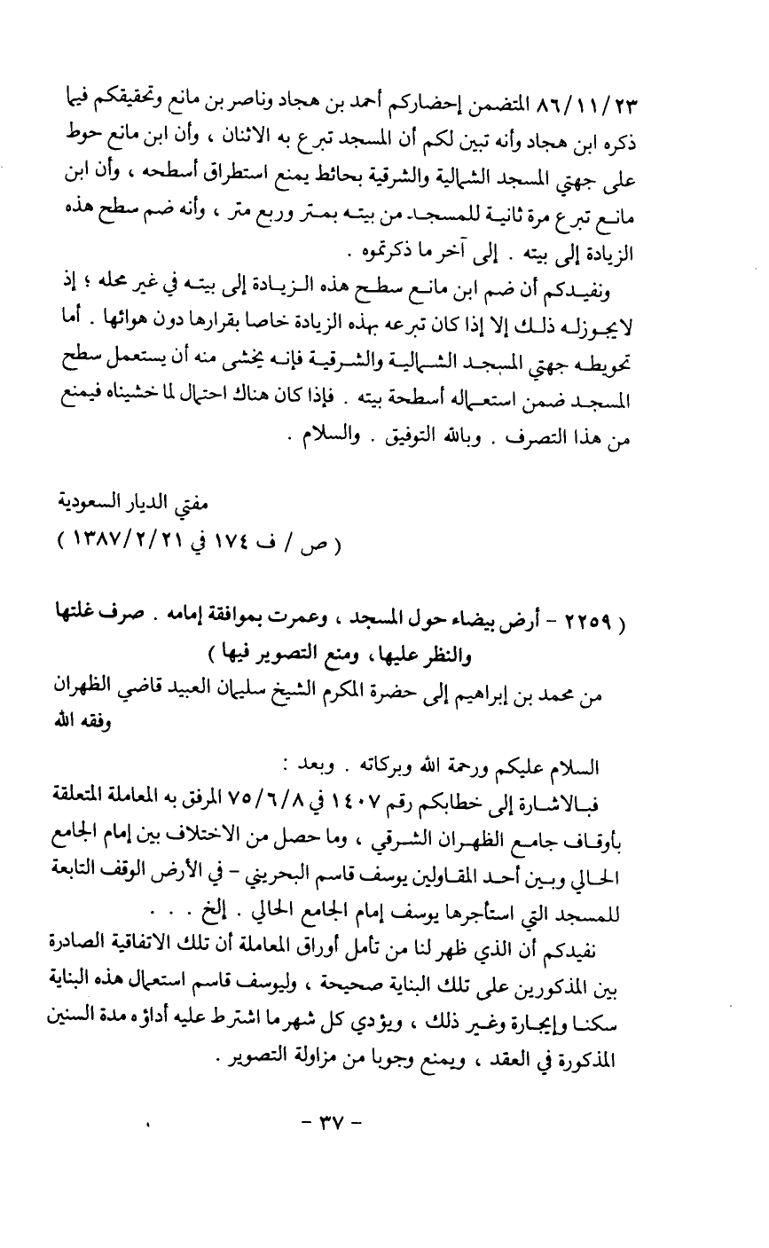 23/11/86 المتضمن إحضاركم أحمد بن هجاد وناصر بن مانع وتحقيقكم فيما ذكره ابن هجاد وأنه تبين لكم أن المسجد تبرع به الاثنان. وأن ابن مانع حوط على جهتي المسجد الشمالية والشرقية بحافظ يمنع استطراق أسطحه، وأن ابن مانع تبرع مرة ثانية للمسجد من بيته بمتر وربع متر، وأنه ضم سطح هذه الزيادة إلى بيته. إلى آخر ما ذكرتموه.