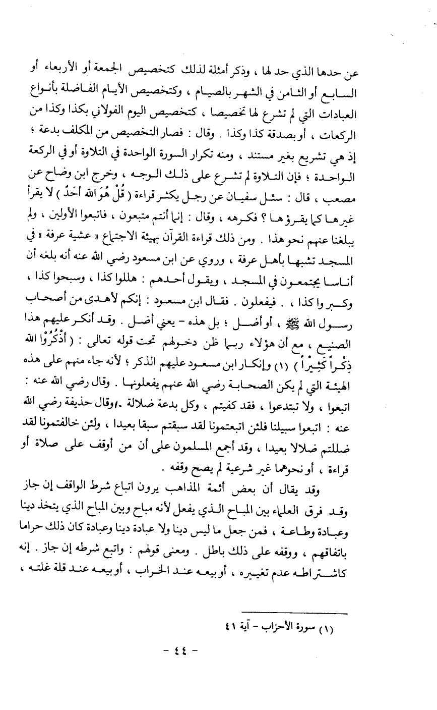 عن حدها الذي حد لها، وذكر أمثلة لذلك كتخصيص الجمعة أو الأربعاء أو السابع أو الثامن في الشهر بالصيام، وكتخصيص الأيام الفاضلة بأنواع العبادات التي لم تشرع لها تخصيصا، كتخصيص اليوم الفولاني بكذا وكذا من الركعات، أو بصدقة كذا وكذا. وقال: فصار التخصيص من المكلف بدعة؛ إذ هي تشريع بغير مستند، ومنه تكرار السورة الواحدة في التلاوة أو في الركعة الواحدة؛ فإن التلاوة لم تشرع على ذلك الوجه، وخرج ابن وضاح عن مصعب، قال: سئل سفيان عن رجل يكثر قراءة (قل هو الله أحد) لايقرأ غيرها كما يقرؤها؟ فكرهه، وقال: إنما أنتم متبعون، فاتبعوا الأولين، ولم يبلغنا عنهم نحو هذا. ومن ذلك قراءة القرآن بهيئة الاجتماع " عشية عرفة " في المسجد تشبها بأهل عرفة، وروني عن ابن مسعود رضي الله عنه أنه بلغه أن أناسا يجتمعون في المسجد، ويقول أحدهم: هللوا كذا، وسبحوا كذا وكبروا كذا، فيفعلون. فقال ابن مسعود: إنكم لأهدى من أصحاب رسول الله صلى الله عليه وسلم، أو أضل؛ بل هذه ـ يعني أضل. وقد أنكر عليهم هذا الصنيع، مع أن هؤلاء ربما ظن دخولهم تحت قوله تعالى: (أذكروا الله ذكراً كثيراً) (¬1) وإنكار ابن مسعود عليهم الذكر؛ لأنه جاء منهم على هذه الهيئة التي لم يكن الصحابة رضي الله عنهم يفعلونها.