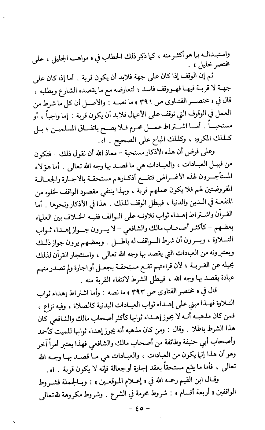 وعلى فرض أن هذه الأذكار مستحبة ـ معاذ الله أن نقول ذلك ـ فتكون من قبيل العبادات، والعبادات هي ماقصد بها وجه الله تعالى. أما هؤلاء المستأجرون لهذه الأغراض فتقع أذكارهم مستحقة بالاجارة والجعالة المفروضتين لهم فلا يكون عملهم قربة، وبهذا ينتفي مقصود الواقف لخلوه من المنفعة في الدين والدنيا، فيبطل الوقف لذلك. هذا في الأذكار ونحوها. أما القرآن واشتراط إهداء ثواب تلاوته على الواقف ففيه الخلاف بين العلماء بعضهم ـ كأكثير أصحاب مالك والشافعي ـ لايرون جواز إهداء ثواب التلاوة، ويرون أن شرط الواقف له باطل. وبعضهم يرون جواز ذلك ويعتبرونه من العبادات التي يقصد بها وجه الله تعالى، واستئجار القرآن لذلك يحيله عن القربة؛ لأن قراءتهم تقع مستحقة يجعل أو اجارة ولم تصدر منهم عبادة يقصد بها وجه الله، فيبطل الشرط لانتفاء القربة منه.