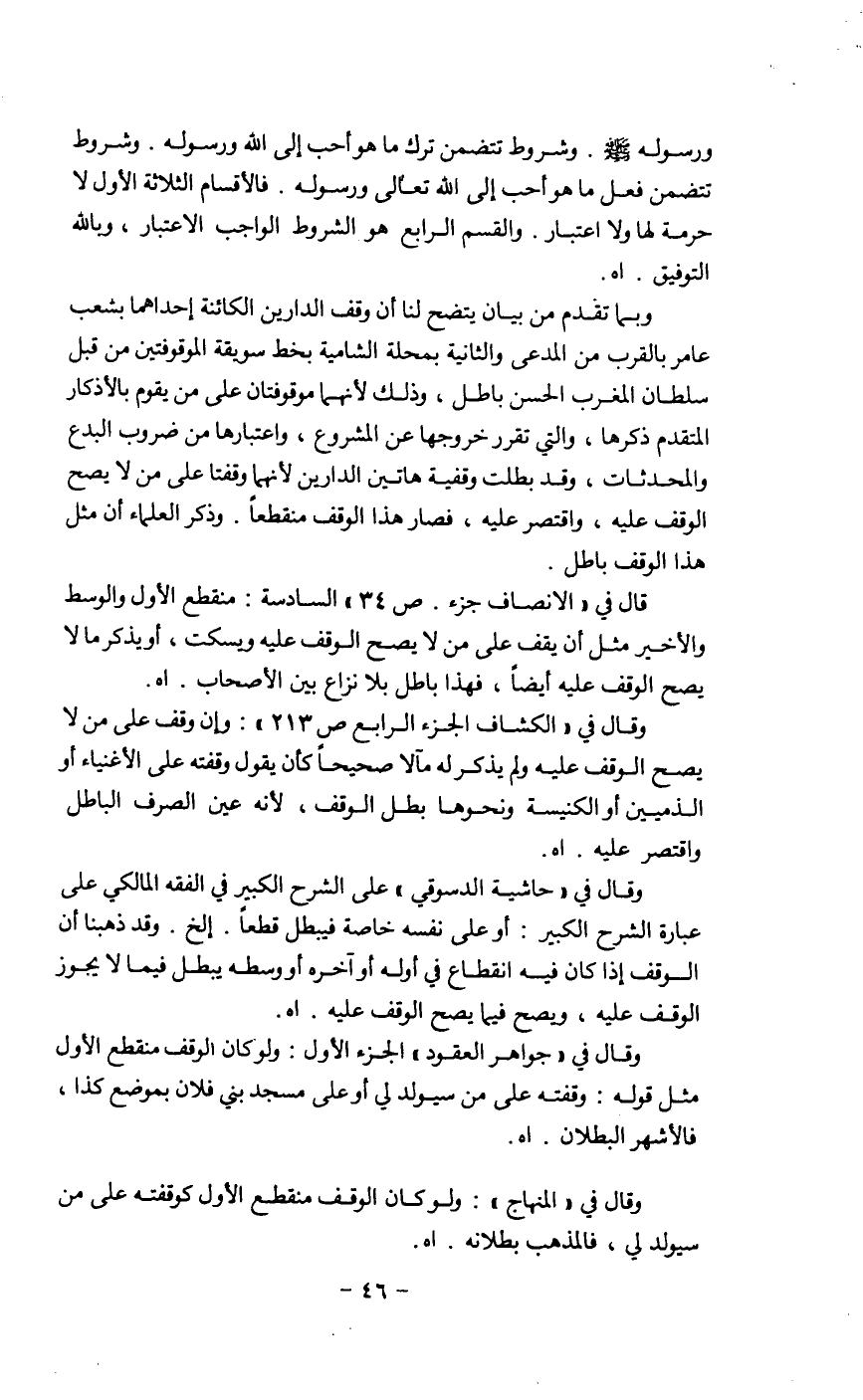 وقال في " حاشية الدسوقي " على الشرح الكبير في الفقه المالكي على عبارة الشرح الكبير: أو على نفسه خاصة فيبطل قطعاً. الخ. وقد ذهبنا أن الوقف إذا كان فيه انقطاع في أوله أوآخره أو وسطه يبطل فيما لايجوز الوقف عليه، ويصح فيما يصح الوقف عليه. أه.