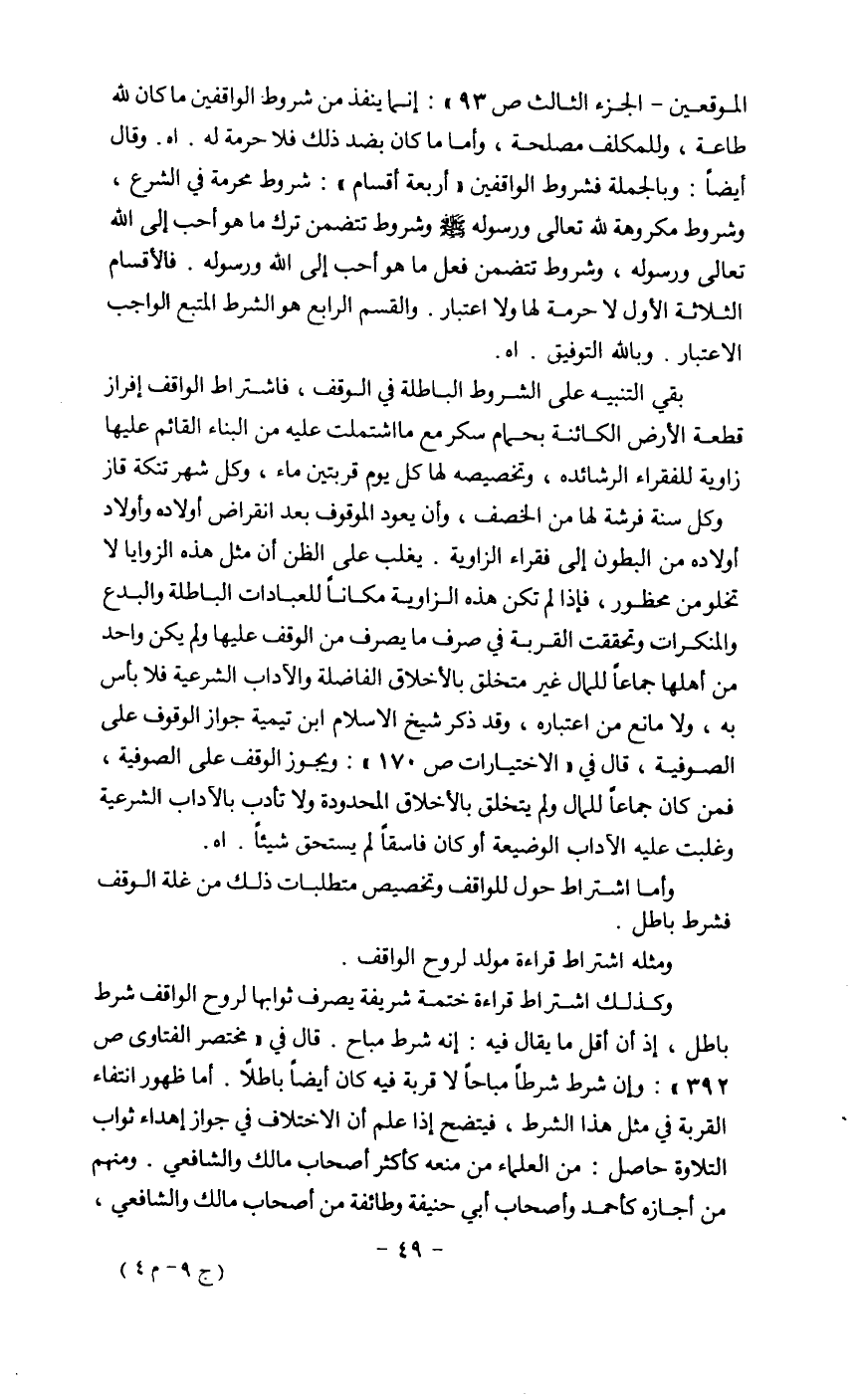 الموقعين ـ الجزء الثالث ص 93 ": إنما ينفذ من شروط الواقفين ما كان لله طاعة، وللمكلف مصلحة، وأما ما كان بضد ذلك فلا حرمة له. أهـ. وقال أيضاً: وبالجملة فشروط الواقفين " أربعة أقسام ": شروط محرمة في الشرع، وشروط مكروهة لله تعالى ورسوله صلى الله عليه وسلم وشروط تتضمن ترك ماهو أحب إلى الله تعالى ورسوله، وشروط تتضمن ترك ماهو أحب إلى الله تعالى ورسوله، وشروط تتضمن فعل ماهو أحب إلى الله ورسوله. فالأقسام الثلاثة الأول لاحرمة لها ولا اعتبار. والقسم الرابع هو الشرط المتبع الواجب الاعتبار. وبالله التوفيق. أهـ.