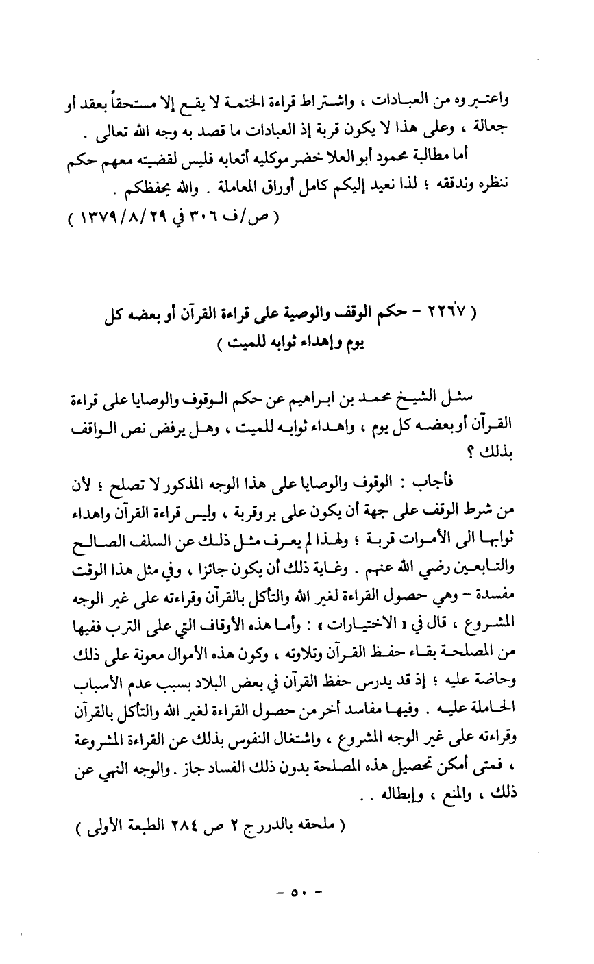 (2267 ـ حكم الوقف والوصية على قراءة القرآن أو بعضه كل يوم وإهداء ثوابه للميت)