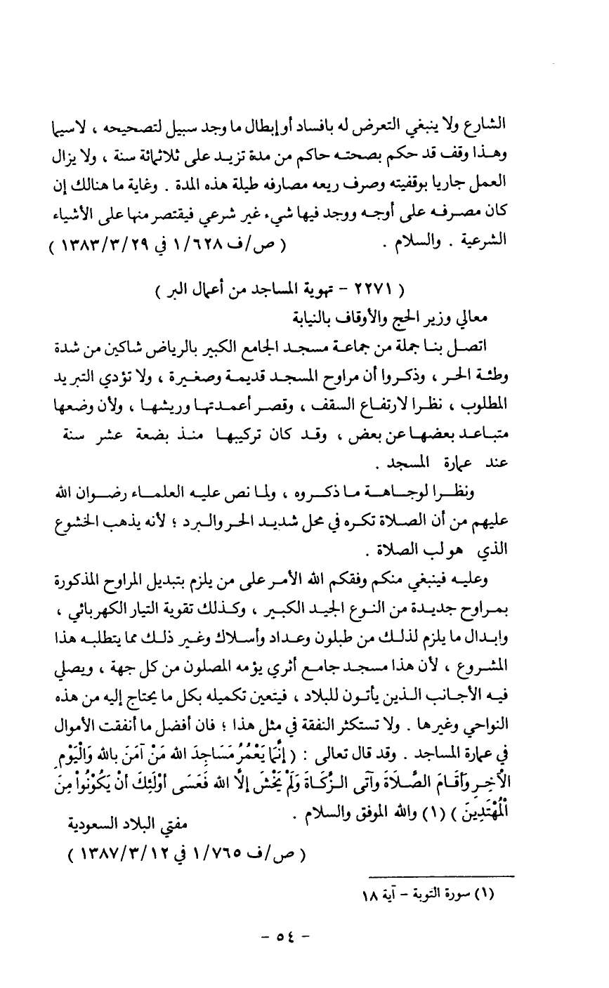 وعليه فينبغي منكم وفقكم الله الأمر على من يلزم بتبديل المراوح المذكورة بمراوح جديدة من النوع الجيد الكبير، وكذلك تقوية التيار الكهربائي، وابدال مايلزم لذلك من طبلون وعداد وأسلاك وغير ذلك مما يتطلبه هذا المشروع، لأن هذا مسجد جامع أثري يؤمه المصلون من كل جهة، ويصلي فيه الأجانب الذين يأتون للبلاد، فيتعين تكميله بكل مايحتاج إليه من هذه النواحي وغيرها. ولاتستكثر النفقة في مثل هذا؛ فإن أفضل ما أنفقت الأموال في عمارة المساجد. وقد قال تعالى: (إنما يعمر مساجد الله من آمن بالله واليوم الآخر واقام الصلاة وآتي الزكاة ولم يخش إلا الله فعسى أولئك أن يكونوا من المهتدين) (¬1) والله الموفق والسلام.