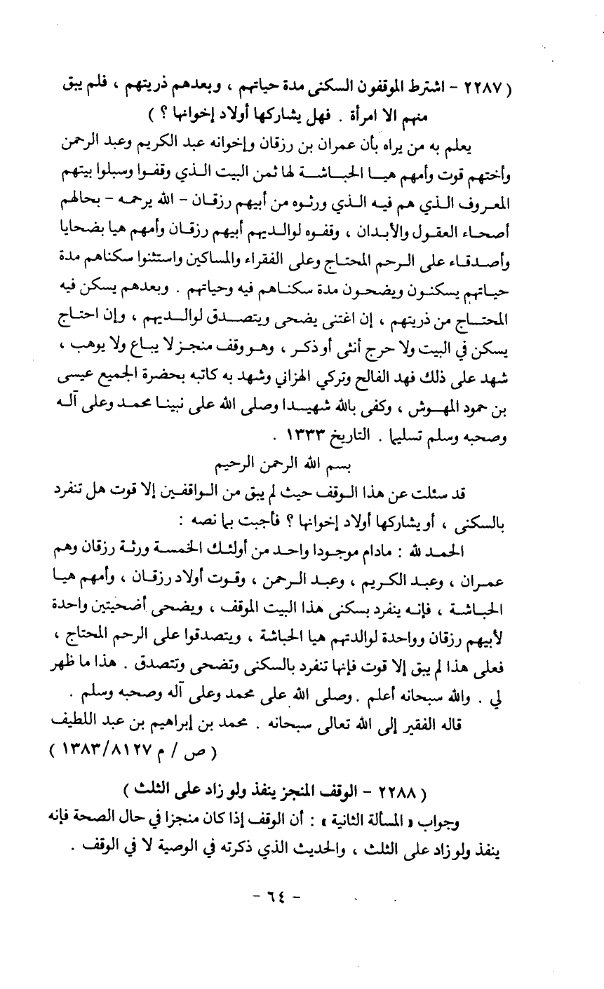 قد سئلت عن هذا الوقف حيث لم يبق من الواقفين إلا قوت هل تنفرد بالسكني، أو يشاركها أولاد إخوانها؟ فأجبت بما نصه: