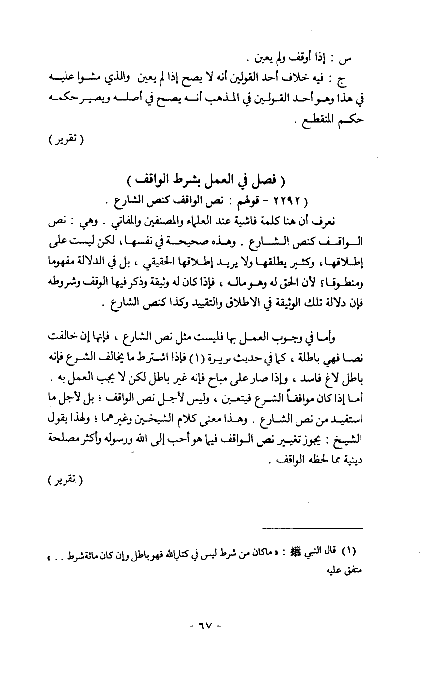 نعرف أن هنا كلمة فاشية عند العلماء والمصنفين والمفاتي. وهي: نص الواقف كنص الشارع. وهذه صحيحة في نفسها، لكن ليست على إطلاقها، وكثير يطلقها ولايريد إطلاقها الحقيقي، بل في الدلالة مفهوما ومنطوقاً؛ لأن الحق له وهو ماله، فإذا كان له وثيقة وذكر فيها الوقف وشروطه فإن دلالة تلك الوثيقة في الاطلاق والتقييد وكذا كنص الشارع.