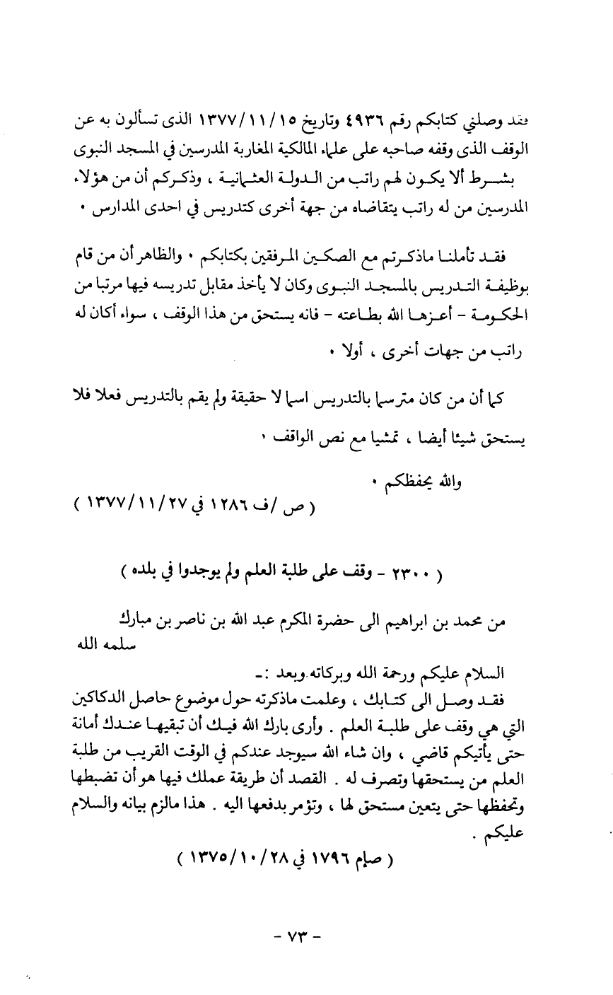 فقد وصلني كتابكم رقم 4936 وتاريخ 15/11/ 1377 الذي تسألون به عن الوقف الذي وقفه صاحبه على علماء المالكية المغاربة المدرسين في المسجد النبوي بشرط ألا يكون لهم راتب من الدولة العثمانية، وذكركم أن من هؤلاء المدرسين من له راتب يتقاضاه من جهة أخرى كتدريس في احدى المدارس.