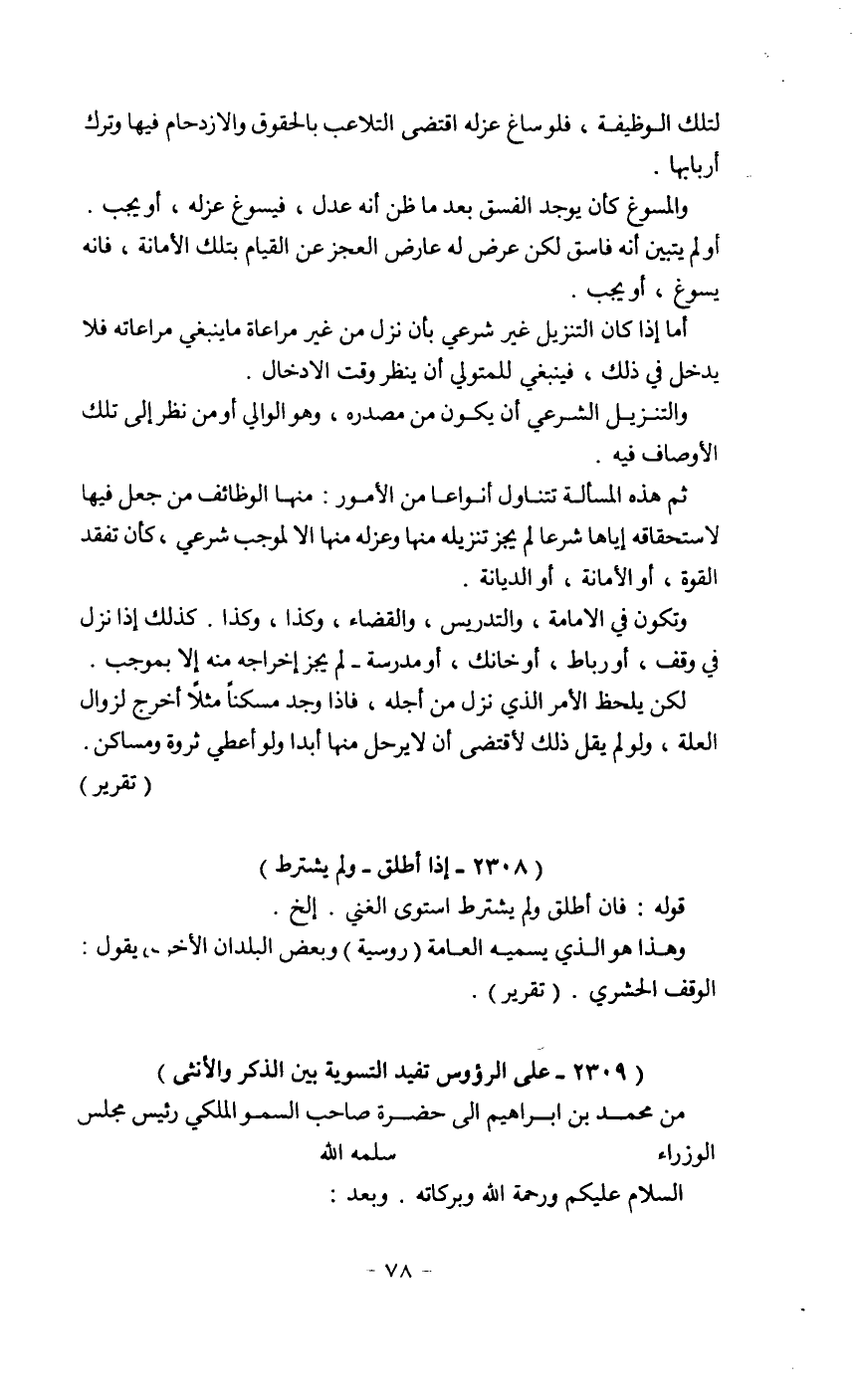 ثم هذه المسألة تتناول أنواعا من الأمور: منها الوظائف من جعل فيها لاستحقاقه إياها شرعا لم يجز تنزيله منها وعزله منها الا لموجب شرعي، كأن تفقد القوة، أو الأمانة، أو الديانة.