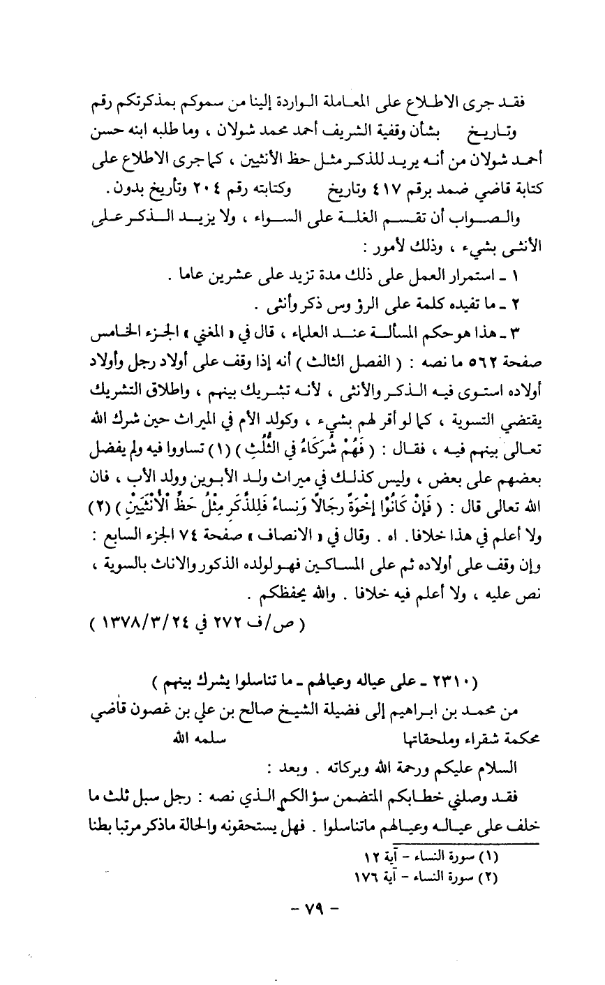 فقد جرى الاطلاع على المعاملة الواردة إلينا من سموكم بمذكرتكم رقم وتاريخ بشأن وقفية الشريف أحمد محمد شولان، وماطلبه ابنه حسن احمد شولان من أنه يويد للذكر مثل حظ الانثيين، كما جرى الاطلاع على كتابة قاضي ضمد برقم 417 وتاريخ وكتابته رقم 204 وتاريخ بدون والصواب أن تقسم الغلة على السواء، ولايزيد الذكر على الأنثى بشيء، وذلك لأمور: