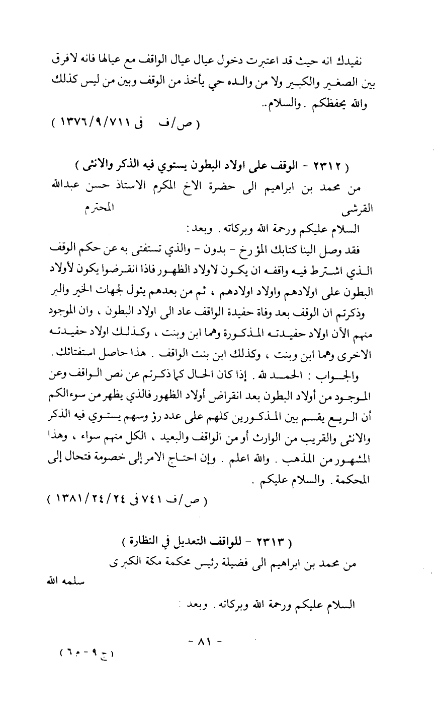 فقد وصل إلينا كتابك المؤرخ ـ بدون ـ والذي تستفتي به عن حكم الوقف الذي اشترط فيه واقفه أن يكون لاولاد الظهور فإذا انقرضوا يكون لأولاد البطون على اولادهم واولاد أولادهم، ثم من بعدهم يئول لجهات الخير والبر وذكرتم أن الوقف بعد وفاة حفيدة الواقف عاد إلى أولاد البطون، وان الموجود منهم الآن اولاد حفيدته المذكورة وهما ابن وبنت، وكذلك اولا حفيدته الاخرى وهما ابن وبنت، وكذلك ابن بنت الواقف. هذا حاصل استفتائك.
