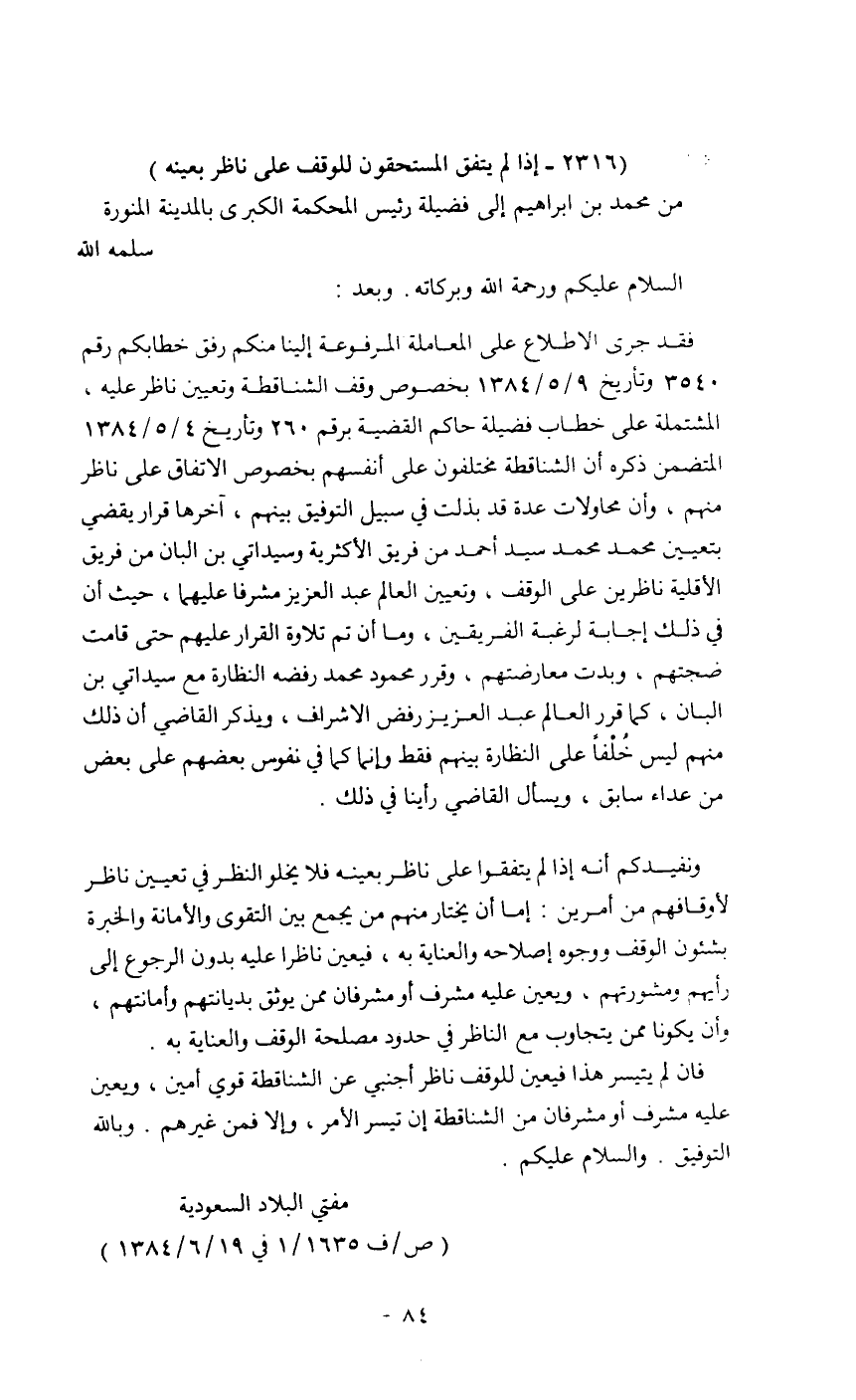 فقد جرى الاطلاع على المعاملة المرفوعة إلينا منكم رفق خطابكم رقم 3540 وتاريخ 9/5/ 1384 بخصوص وقف الشناقطة وتعيين ناظر عليه، المشتملة على خطاب فضيلة حاكم القضية برقم 260 وتاريخ 4/5/ 1384 المتضمن ذكره أن الشناقطة مختلفون على أنفسهم بخصوص الاتفاق على ناظر منهم، وأن محاولات عدة قد بذلت في سبيل التوفيق بينهم، وآخرها قرار يقضي بتعيين محمد محمد سيد أحمد من فريق الأكثرية وسيداتي بن البان من فريق الاقلية ناظرين على الوقف، وتعيين العالم عبد العزيز مشرفا عليهما، حيث أن في ذلك إجابة لربغة الفريقين، وما أن تم تلاوة القرار عليهم حتى قامت ضجتهم، وبدت معارضتهم، وقرر محمود محمد رفضه النظارة مع سيداتي بن البان، كما قرر العالم عبد العزيز رفض الاشراف، ويذكر القاضي أن ذلك منهم ليس خلفا على النظارة بينهم فقط وإنما كما في نفوس بعضهم على بعض من عداء سابق، ويسأل القاضي رأينا في ذلك.
