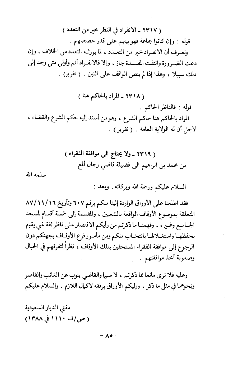 فقد أطلعنا على الأوراق الواردة إلينا منكم برقم 607 وتاريخ 16/11/ 87 المتعلقة بموضوع الأوقاف الواقعة بالشعبين، والمقسمة إلى خمسة أقسام لمسجد الجامع وغيره، وفهمنا ماذكرتم من رأيكم الاقتصار على ناظر ثقة غني يقوم بحفظها واستغلالها بأنتخاب منكم ومن مأمور فرع الأوقاف بجهتكم دون الرجوع إلى موافقة الفقراء المستحقين بتلك الأوقاف، نظراً لتفرقهم في الجبال وصعوبة أخذ موافقتهم.