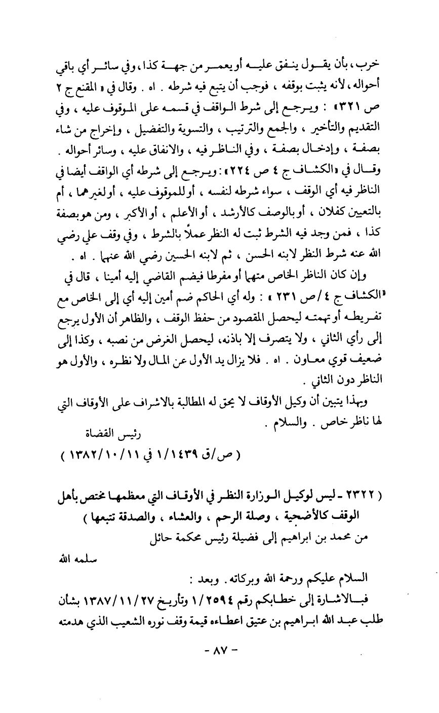 (2322 ـ ليس لوكيل الوزراة النظر في الأوقاف التي معظمها مختص بأهل الوقف كالأضحية، وصلة الرحم، والعشاء، والصدقة تتبعها)
