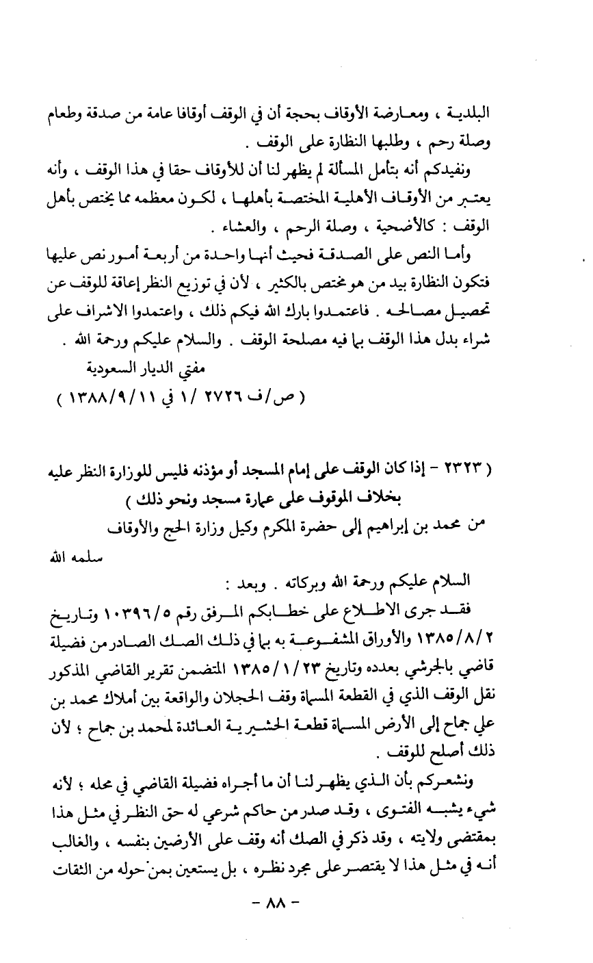(2323 ـ إذا كان الوقف على إمام المسجد أو مؤذنه فليس للوزراة النظر عليه بخلاف الموقوف على عمارة مسجد ونحو ذلك)
