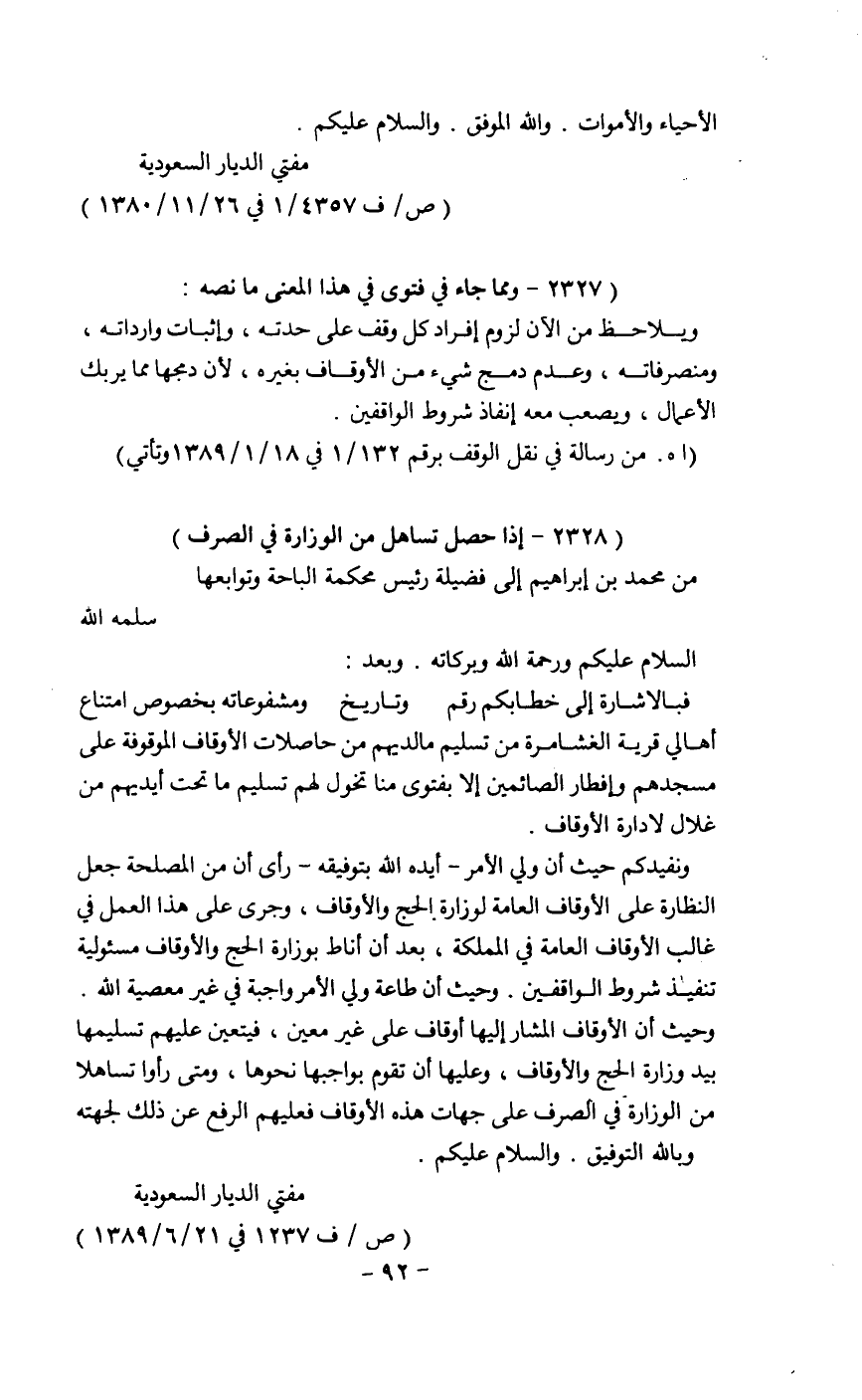 ونفيدكم حيث أن ولي الأمر ـ أيده الله بتوفيقه ـ رأي أن من المصلحة جعل النظارة على الأوقاف العامة لوزارة الحج والأوقاف، وجرى على هذا العمل في غالب الأوقاف العامة لوزارة الحج والأوقاف، وجرى على هذا العمل في غالب الأوقاف العامة في المملكة، بعد أن أناط بوزارة الحج والأوقاف مسئولية تنفيذ شروط الواقفين. وحيث أن طاعة ولي الأمر واجبة في غير معصية الله.