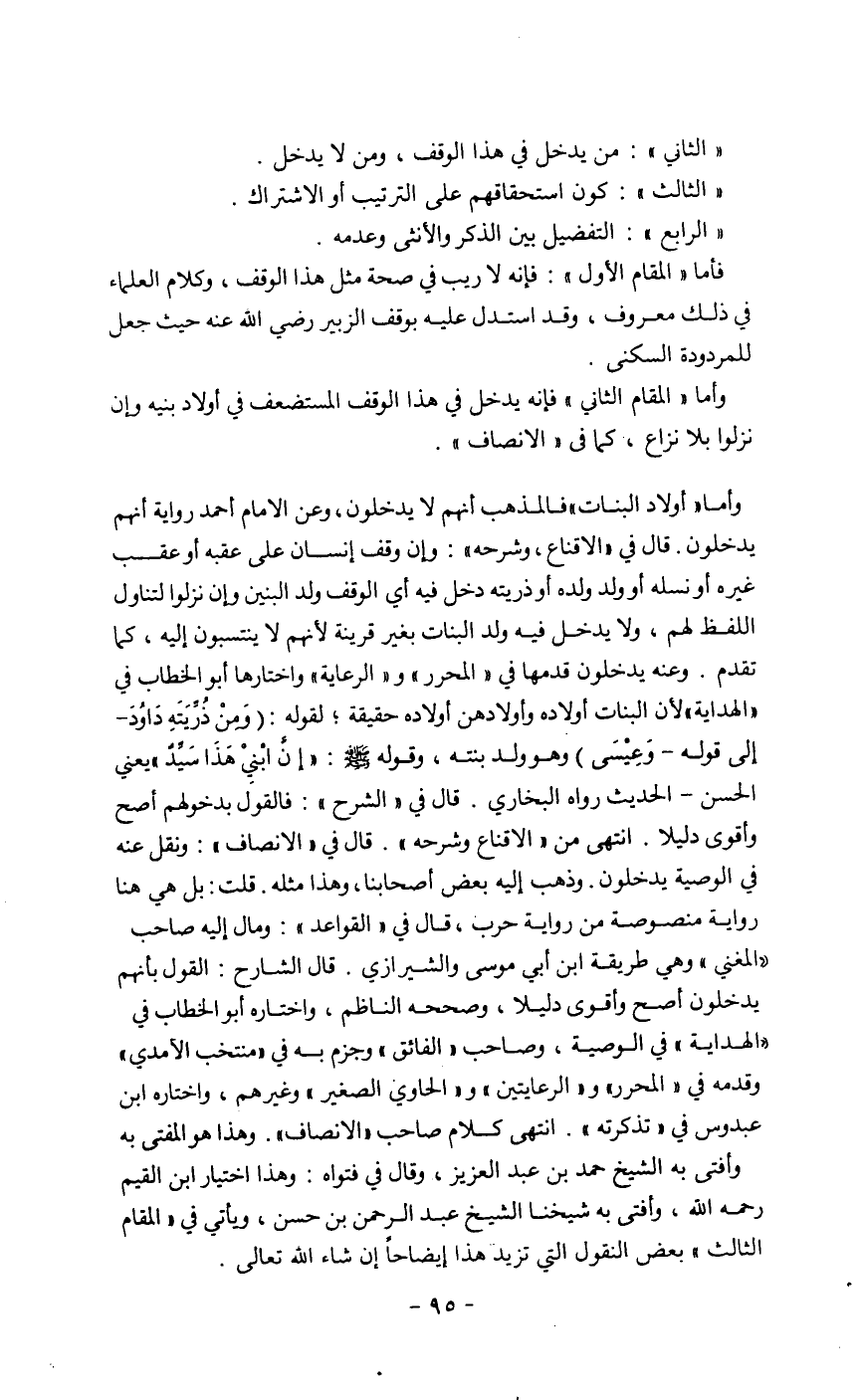 وأما " أولاد البنات " فالمذهب أنهم لايدخلون، وعن الامام أحمد رواية أنهم يدخلون. قال في " الاقناع، وشرحه " وإن وقف إنسان على عقبه أوعقب غيره أو نله أو ولد ولده أو ذريته دخل فيه أي الوقف ولد البنين وإن نزلوا لتناول اللفظ لهم، ولايدخل فيه ولد البنات بغير قرينة لأنهم لاينتسبون إليه، كما تقدم. وعنه يدخلون قدمها في " المحرر " و " الرعاية " واختارها أبو الخطاب في " الهداية " لأن البنات أولاده وأولادهن أولاده حقيقة؛ لقوله: (ومن ذريته داود ـ إلى قوله ـ وعيسى) وهو ولد بنته، وقوله صلى الله عليه وسلم: " إن ابني هذا سيد " بمعنى الحسن ـ الحديث رواه البخاري. قال في " الشرح ": فالقول بدخولهم أصح وأقوى دليلا. انتهى من" الاقناع وشرحه ". قال في " الانصاف ": ونقل عنه في الوصية يدخلون. وذهب إليه بعض أصحابنا، وهذا مثله. قلت: بل هي هنا رواية منصوصة من رواية حرب، قال في " القواعد ": ومال إليه صاحب " المغني " وهي طريقة أبن أبي موسى والشيرازي. قال الشارح: القول بأنهم يدخلون أصح وأقوى دليلا، وصححه الناظم، واختاره أبوالخطاب في " الهداية" في الوصية، وصاحب " الفائق " وجزم به في " منتخب الأمدي " وقدمه في