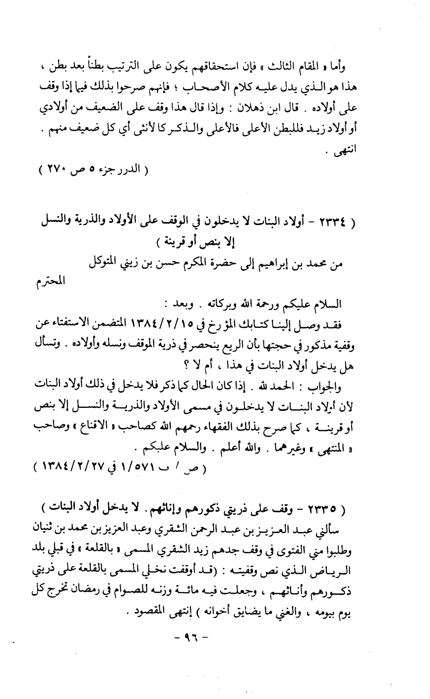 (2334 ـ أولاد البنات لايدخلون في الوقف على الأولاد والذرية والنسل إلا بنص أو قرينة) .