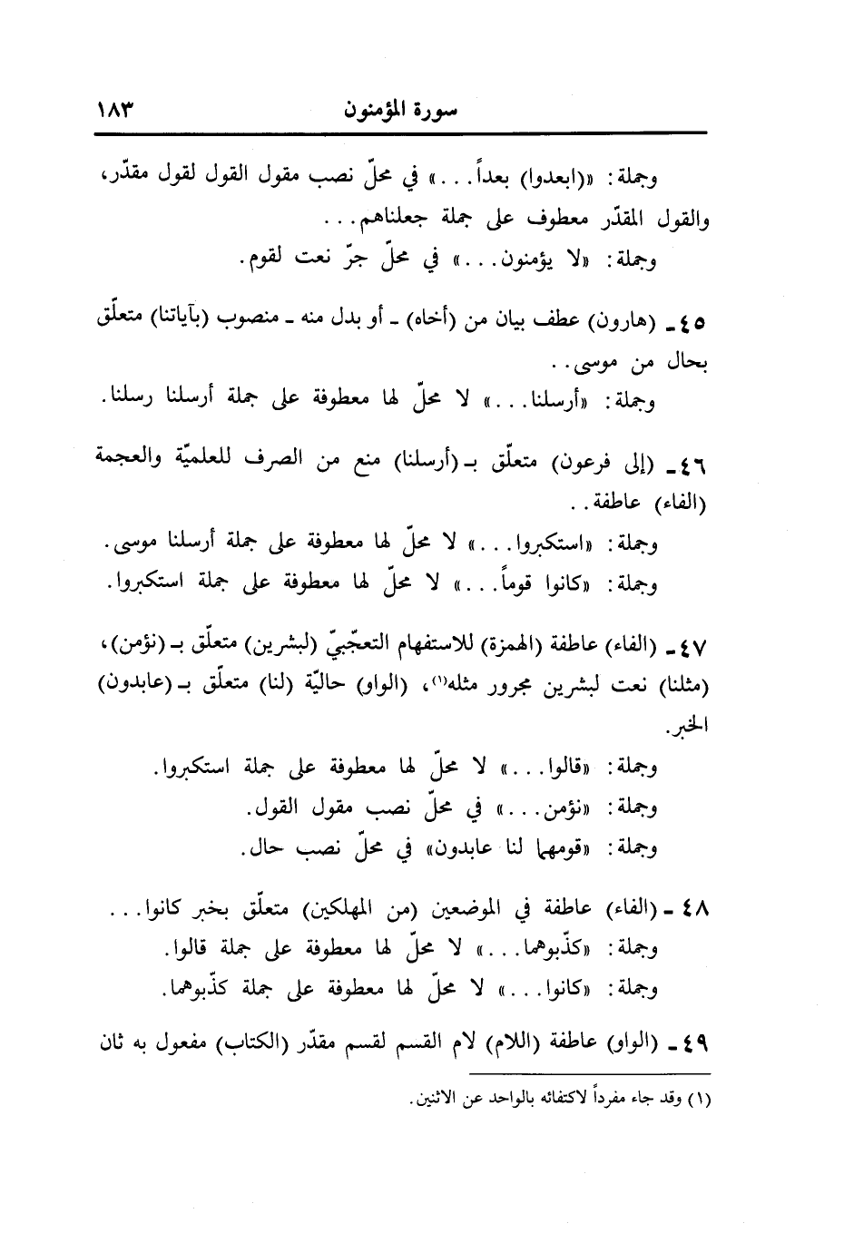 والمصدر المؤوّل (أنّهم شاقّوا ... ) في محلّ جرّ بالباء متعلّق بخبر المبتدأ ذلك.. أي ذلك العذاب أو العقاب بسبب مشاقّتهم لله تعالى ورسوله (الواو) استئنافيّة (من) اسم شرط جازم مبنيّ في محلّ رفع مبتدأ (يشاقق) مضارع مجزوم، وحرّك بالكسر لالتقاء الساكنين، والفاعل ضمير مستتر تقديره هو يعود على من (الله) لفظ الجلالة مثل السابق وكذلك (رسوله) ، (الفاء) رابطة لجواب الشرط «1» ، (إن) حرف مشبّه بالفعل- ناسخ- (الله) لفظ الجلالة اسم إنّ منصوب (شديد) خبر مرفوع (العقاب) مضاف إليه مجرور.